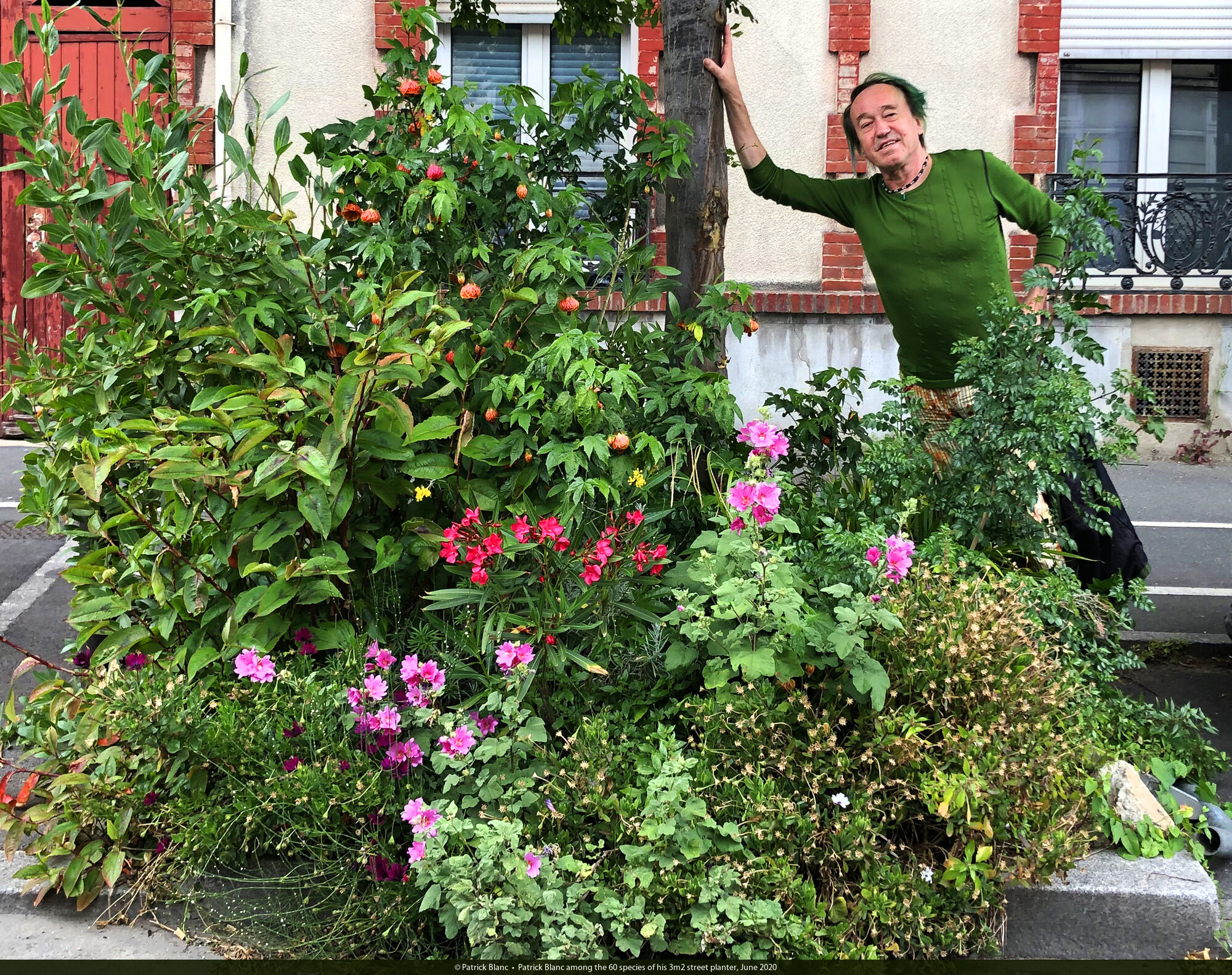 Patrick Blanc among the 60 species of his 3m2 street planter, June 2020