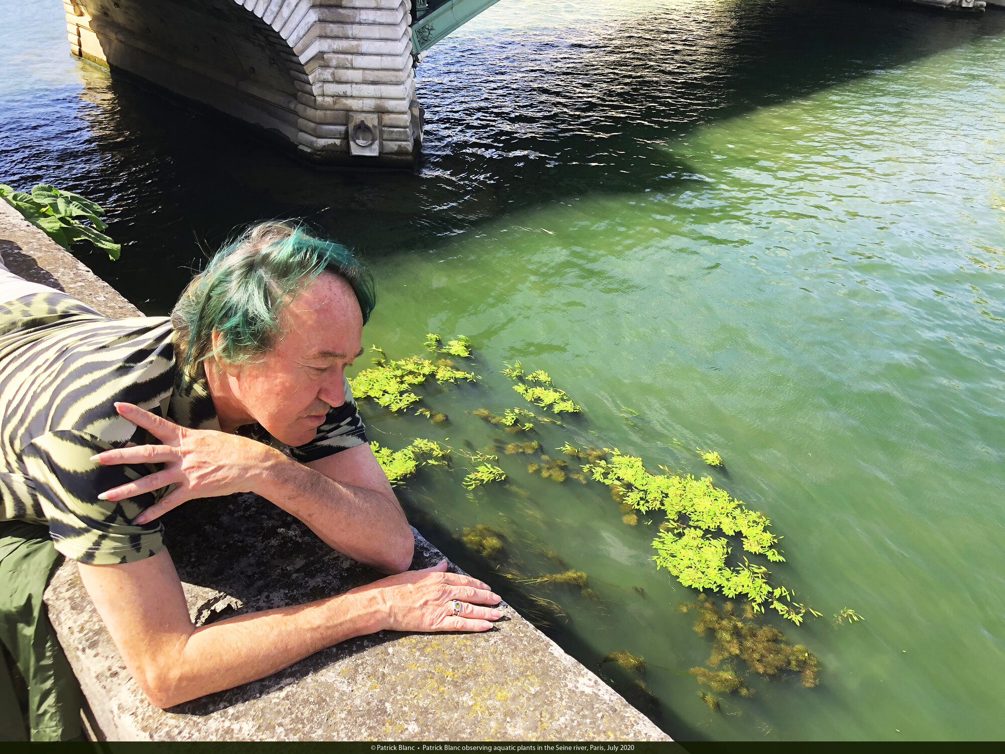 Patrick Blanc observing aquatic plants in the Seine river, Paris, July 2020