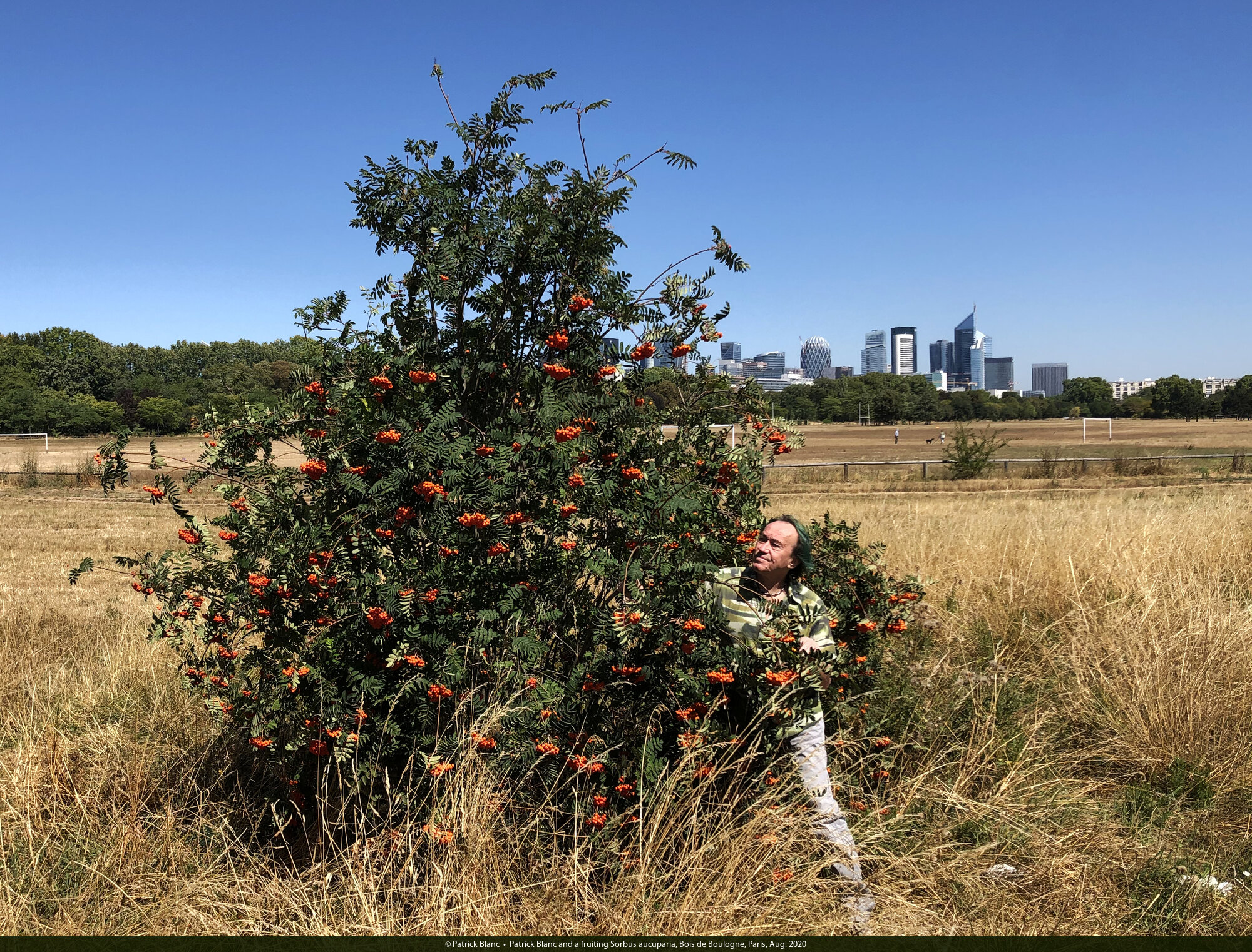 Patrick Blanc and a fruiting Sorbus aucuparia, Bois de Boulogne, Paris, Aug. 2020