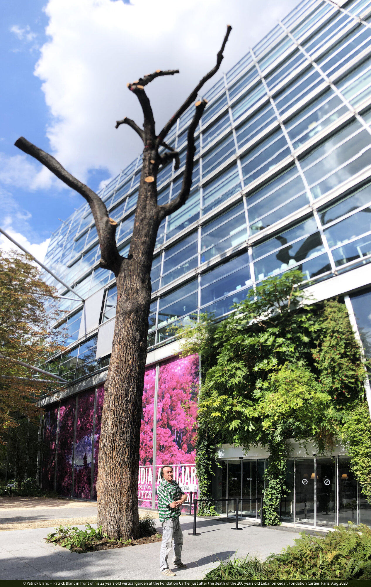 Patrick Blanc in front of his 22 years old vertical garden at the Fondation Cartier just after the death of the 200 years old Lebanon cedar, Fondation Cartier, Paris, Aug.2020