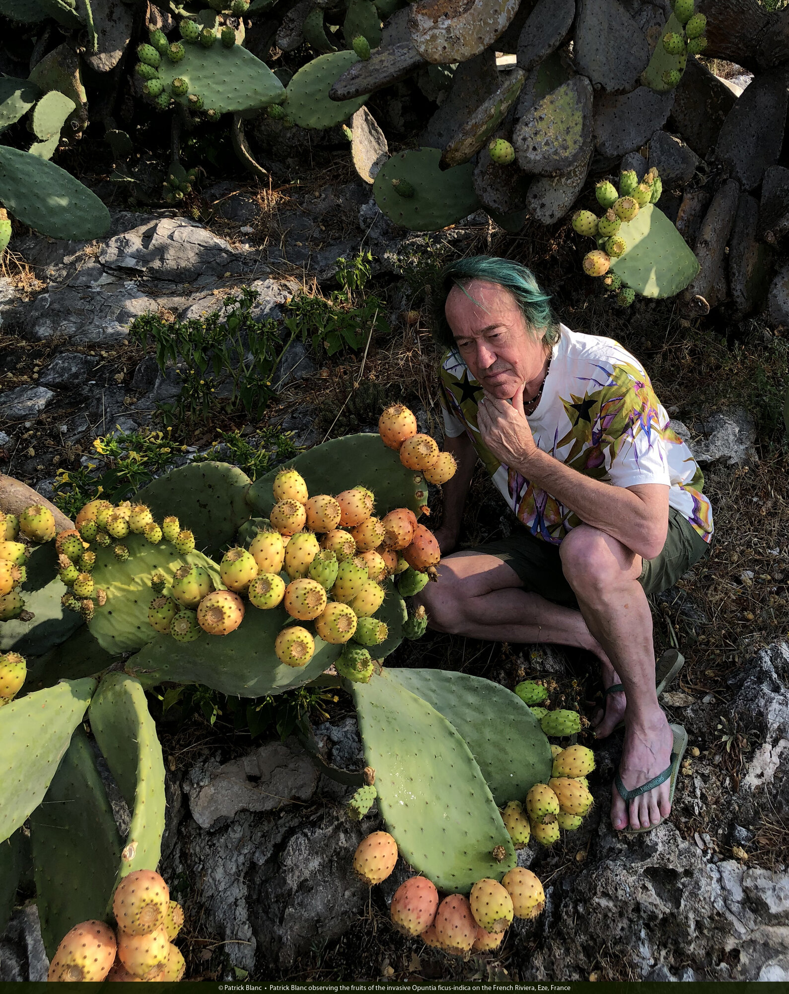 Patrick Blanc observing the fruits of the invasive Opuntia ficus-indica on the French Riviera, Eze, France