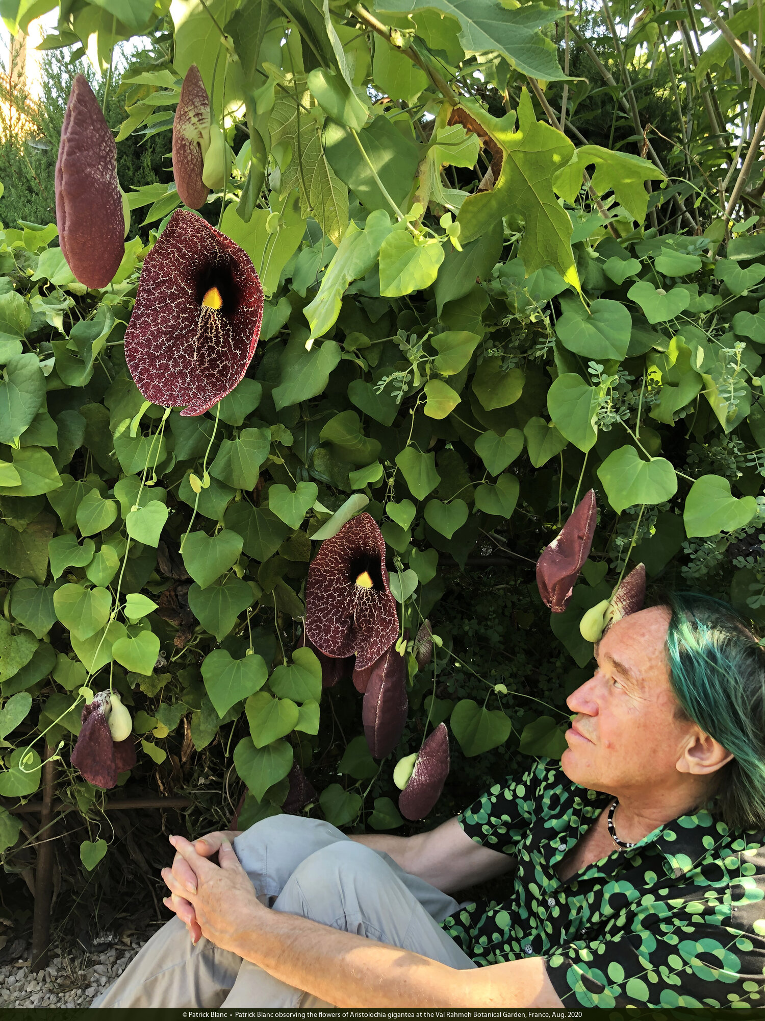 Patrick Blanc and Aristolochia gigantea, Val Rahmeh Botanical Garden, France, Aug. 2020