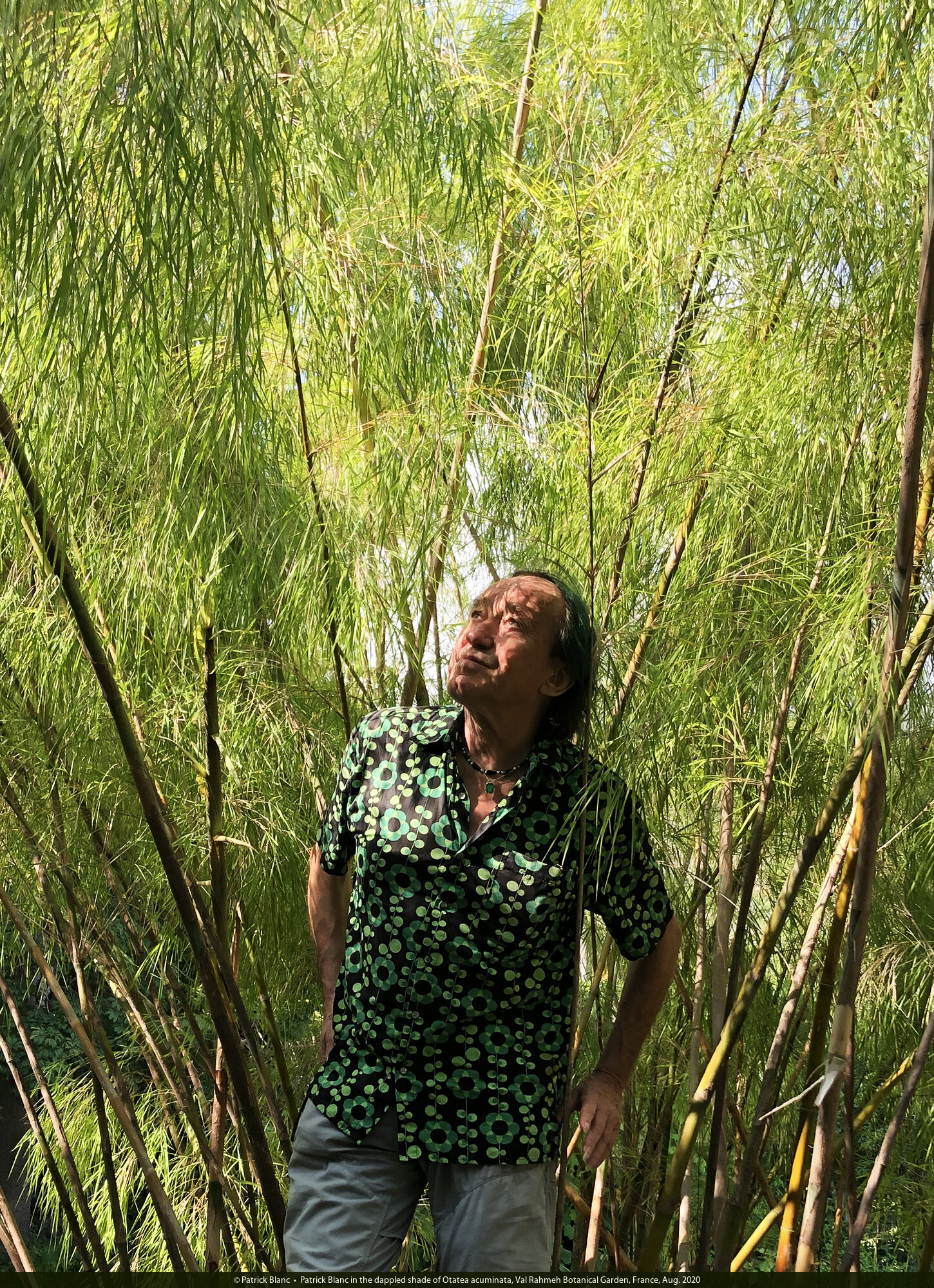 Patrick Blanc in the dappled shade of Otatea acuminata, Val Rahmeh Botanical Garden, France, Aug. 2020