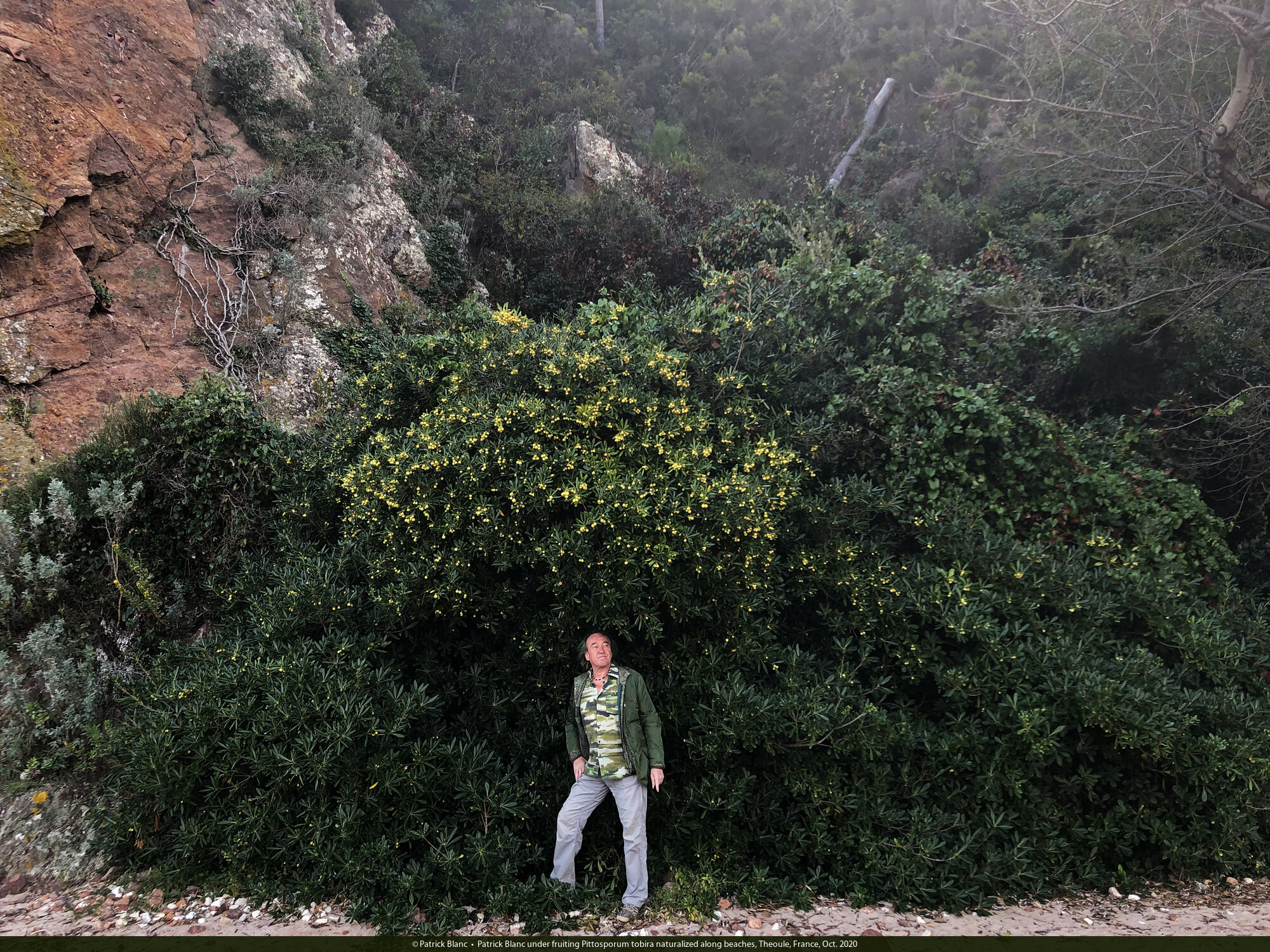 Patrick Blanc under fruiting Pittosporum tobira naturalized along beaches, Theoule, France, Oct. 2020