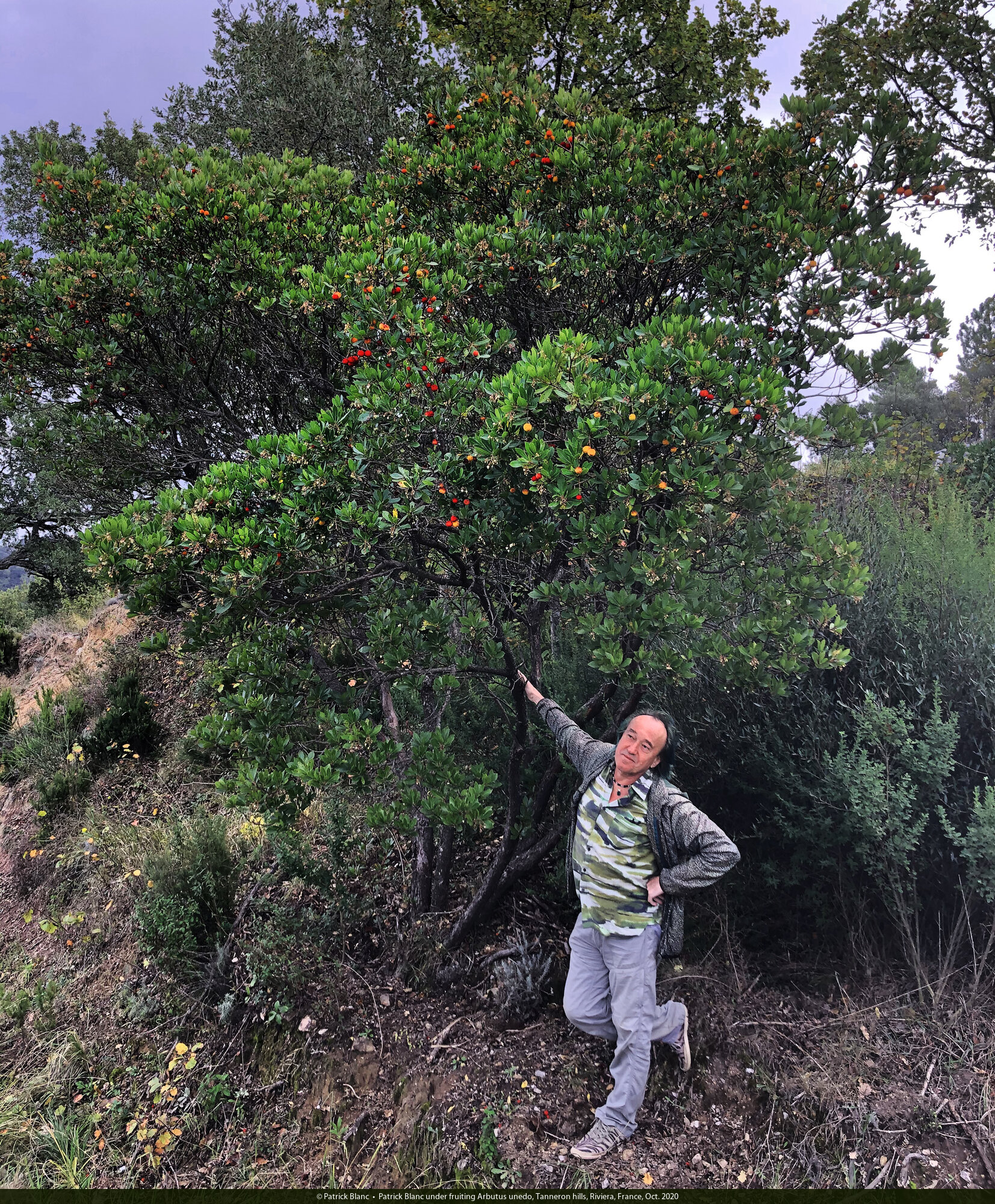 Patrick Blanc under fruiting Arbutus unedo, Tanneron hills, Riviera, France, Oct. 2020