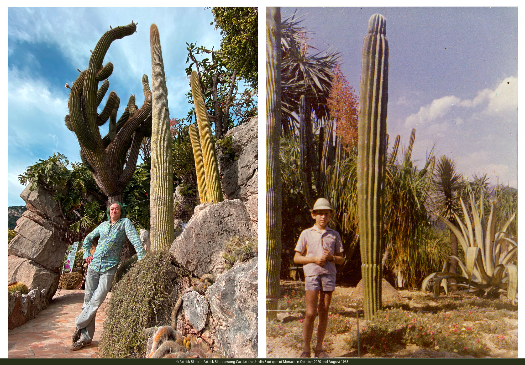 Patrick Blanc among Cacti at the Jardin Exotique of Monaco in October 2020 and August 1963