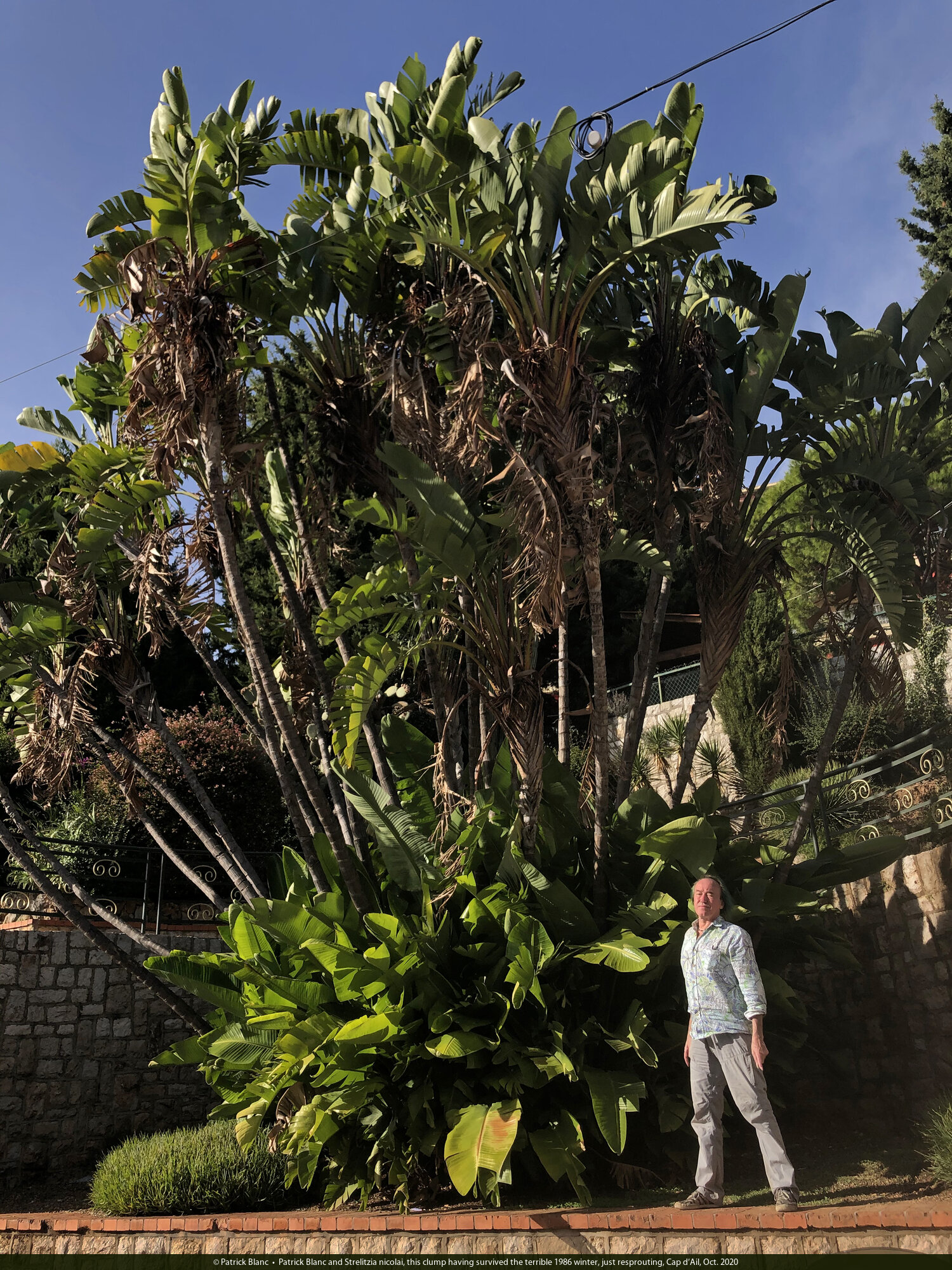 Patrick Blanc and Strelitzia nicolai, this clump having survived the terrible 1986 winter, just resprouting, Cap d'Ail, Oct. 2020