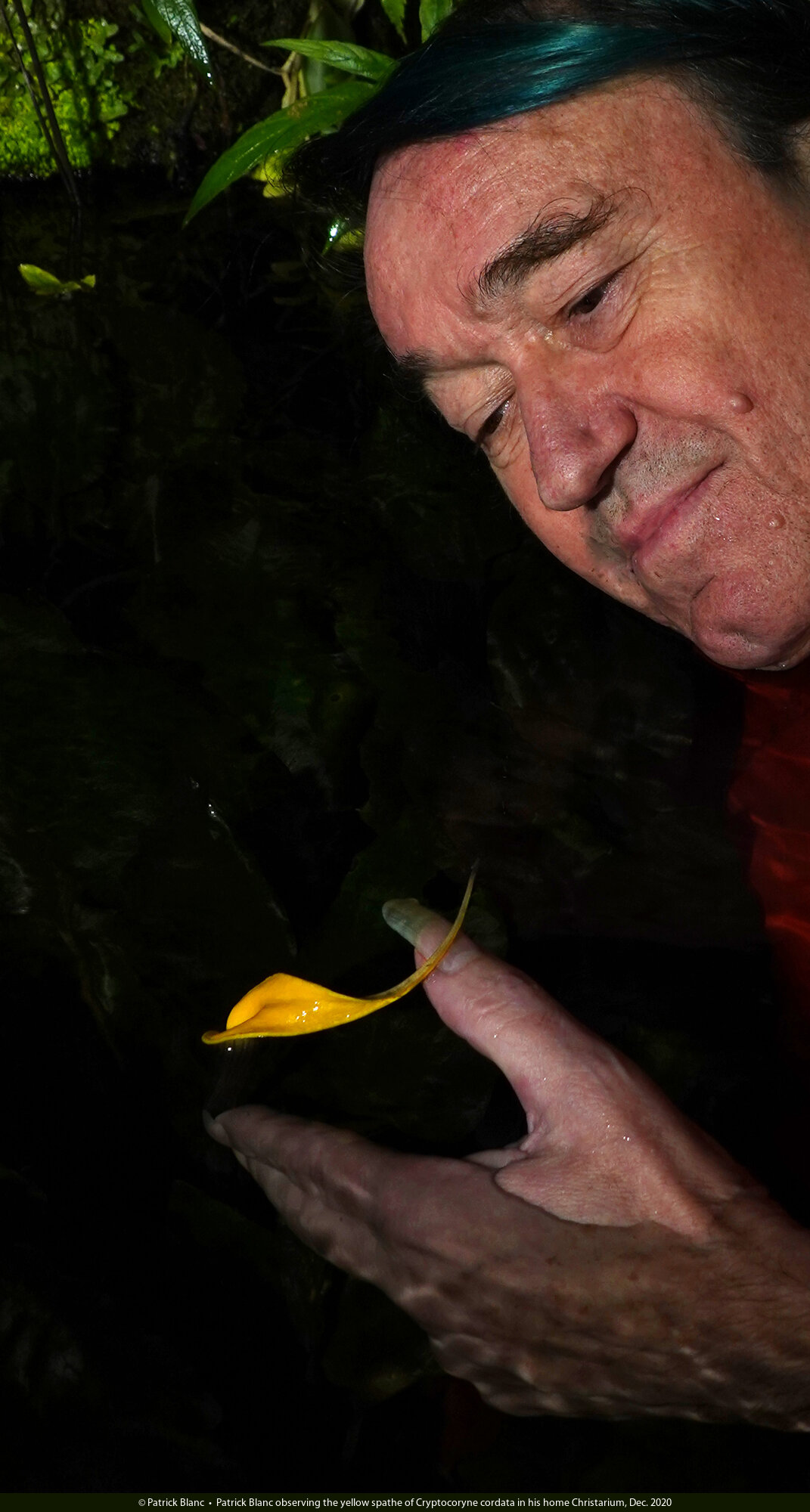 Patrick Blanc bathing at home in his Christarium to observe the bright yellow spathe of Cryptocoryne cordata, Dec. 2020