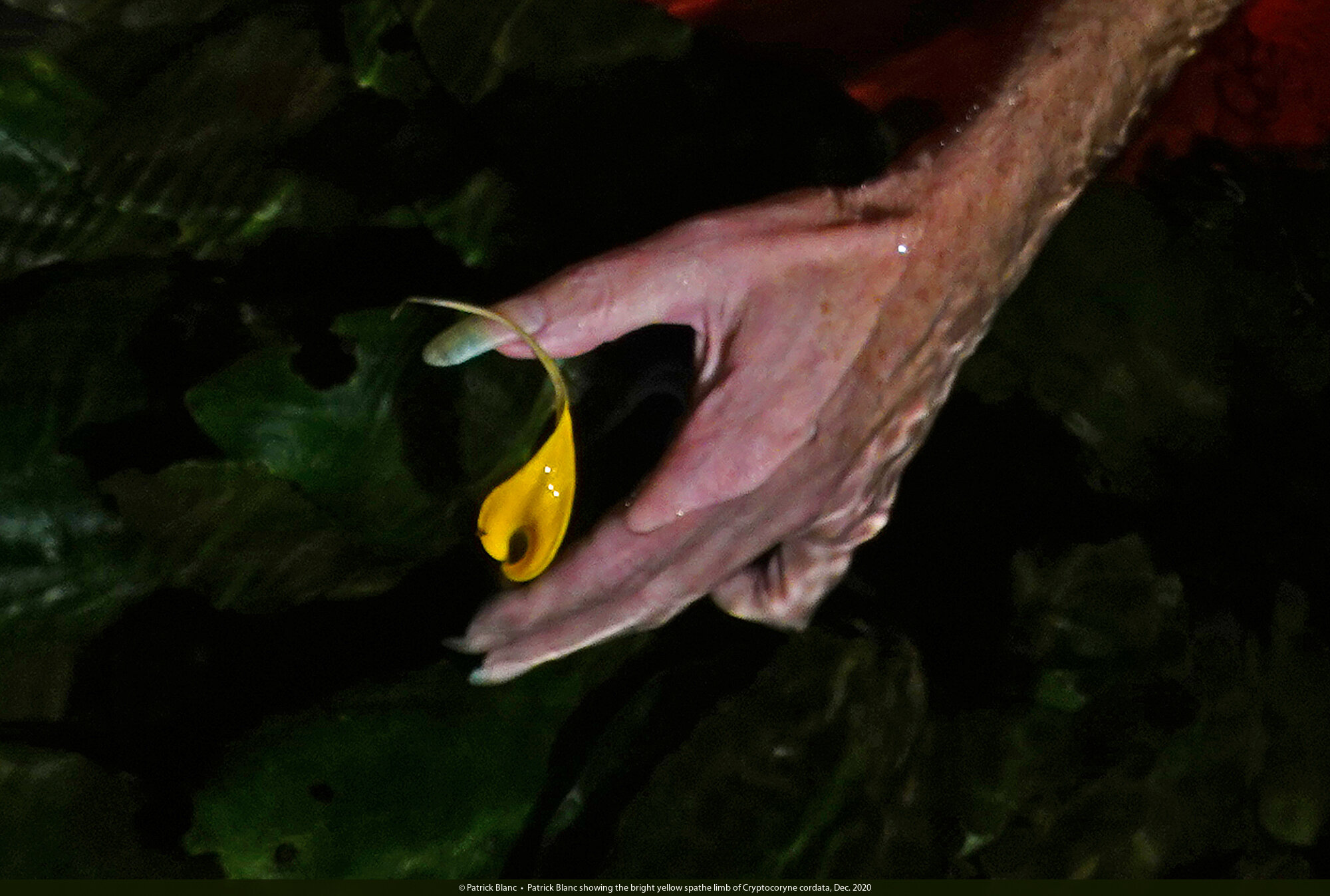 Patrick Blanc showing the bright yellow spathe limb of Cryptocoryne cordata, Dec. 2020