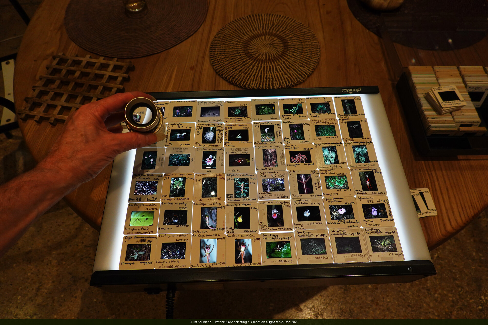 Patrick Blanc selecting his slides on a light table, Dec. 2020