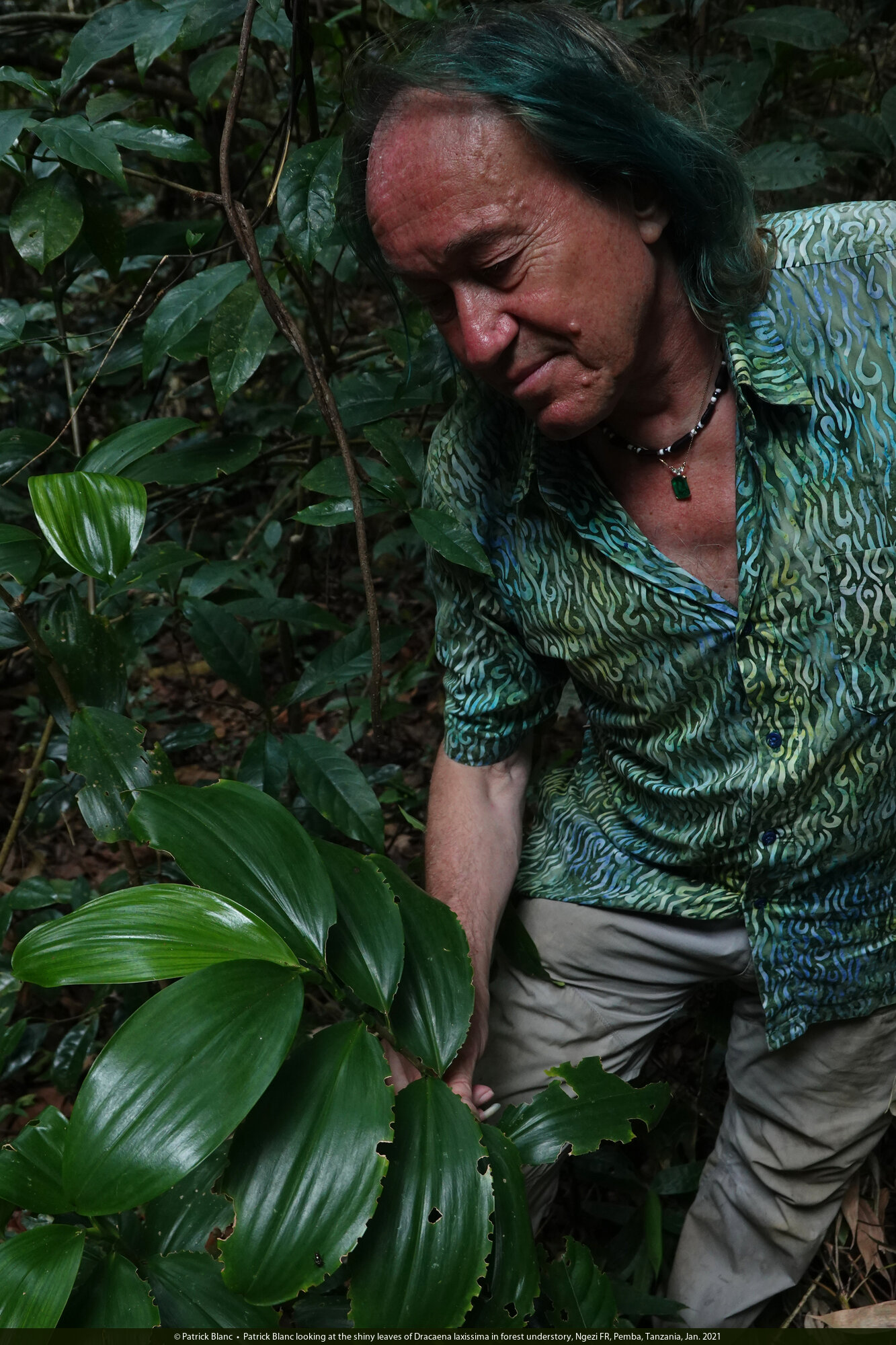 Patrick Blanc looking at the shiny leaves of Dracaena laxissima in forest understory, Ngezi FR, Pemba, Tanzania, Jan. 2021