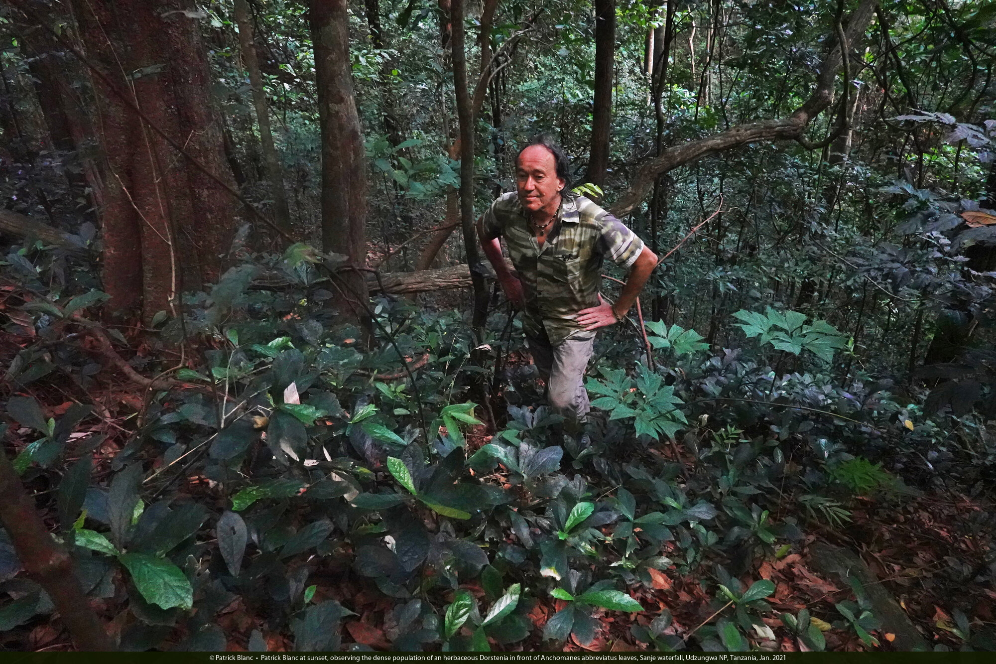 Patrick Blanc at sunset, observing the dense population of an herbaceous Dorstenia in front of Anchomanes abbreviatus leaves, Sanje waterfall, Udzungwa NP, Tanzania, Jan. 2021