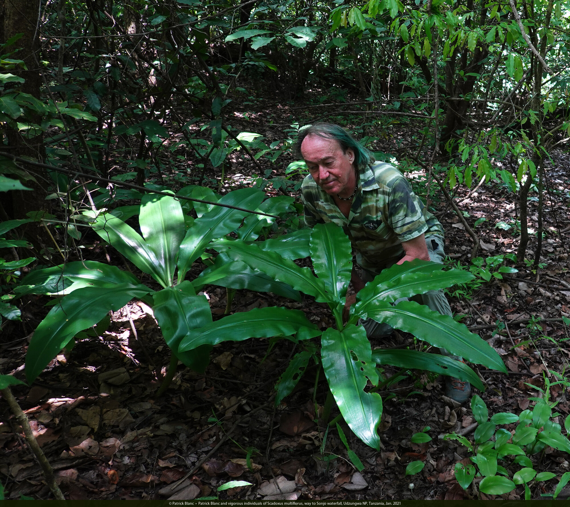 Patrick Blanc and vigorous individuals of Scadoxus multiflorus, way to Sonjo waterfall, Udzungwa NP, Tanzania, Jan. 2021