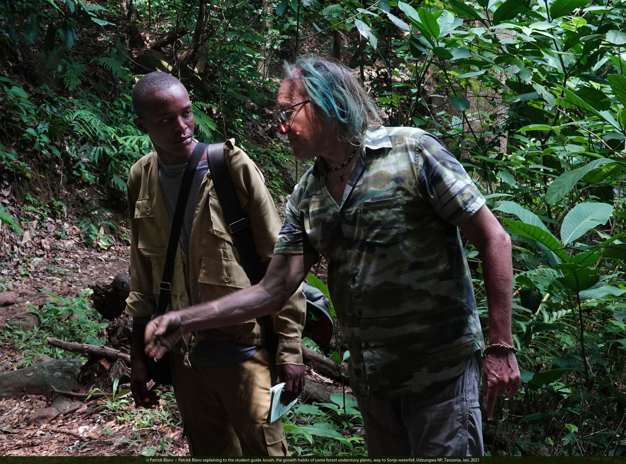 Patrick Blanc explaining to the student guide Josiah, the growth habits of some forest understory plants, way to Sonjo waterfall, Udzungwa NP, Tanzania, Jan. 2021