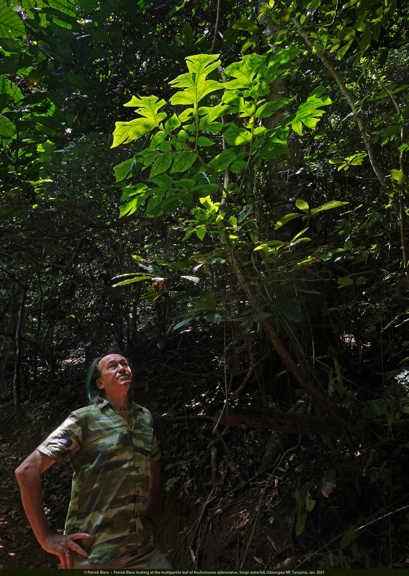 Patrick Blanc looking at the multipartite leaf of Anchomanes abbreviatus, Sonjo waterfall, Udzungwa NP, Tanzania, Jan. 2021