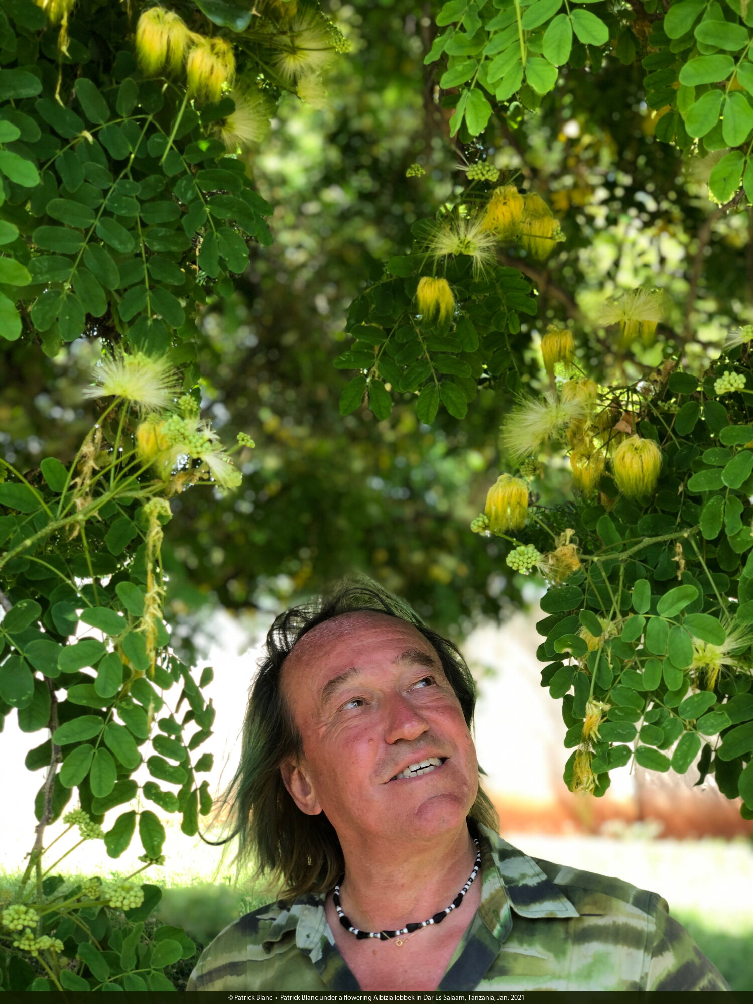Patrick Blanc under a flowering Albizia lebbek in Dar Es Salaam, Tanzania, Jan. 2021