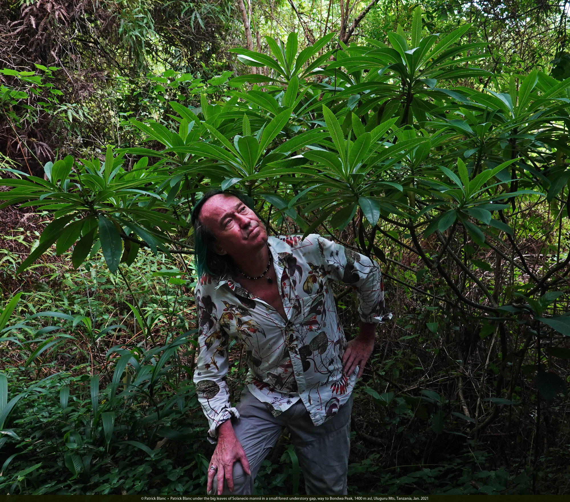 Patrick Blanc under the big leaves of Solanecio mannii in a small forest understory gap, way to Bondwa Peak, 1400 m asl, Uluguru Mts, Tanzania, Jan. 2021