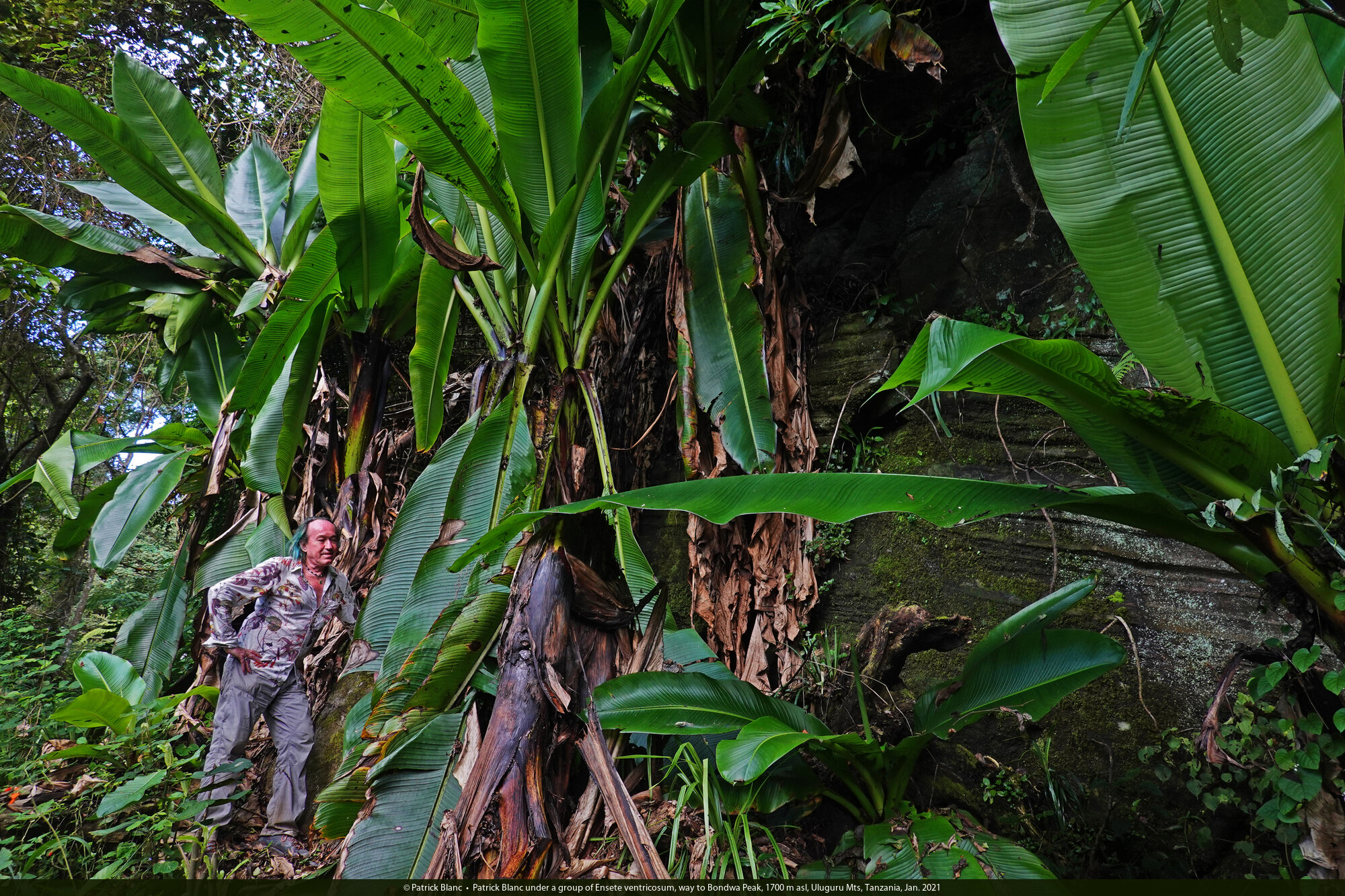 Patrick Blanc under a group of Ensete ventricosum, way to Bondwa Peak, 1700 m asl, Uluguru Mts, Tanzania, Jan. 2021