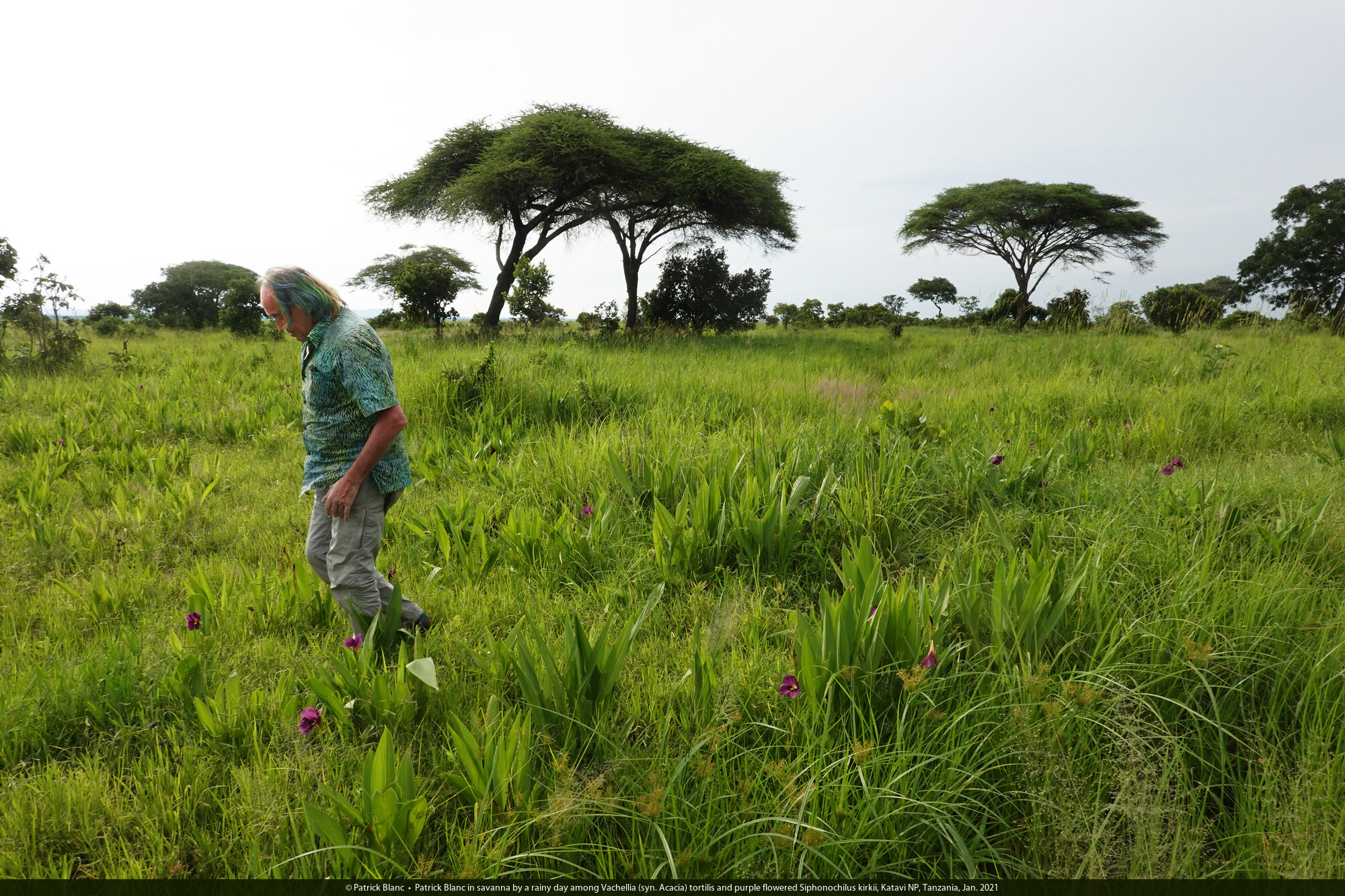 Patrick Blanc in savanna by a rainy day among Vachellia (syn. Acacia) tortilis and purple flowered Siphonochilus kirkii, Katavi NP, Tanzania, Jan. 2021