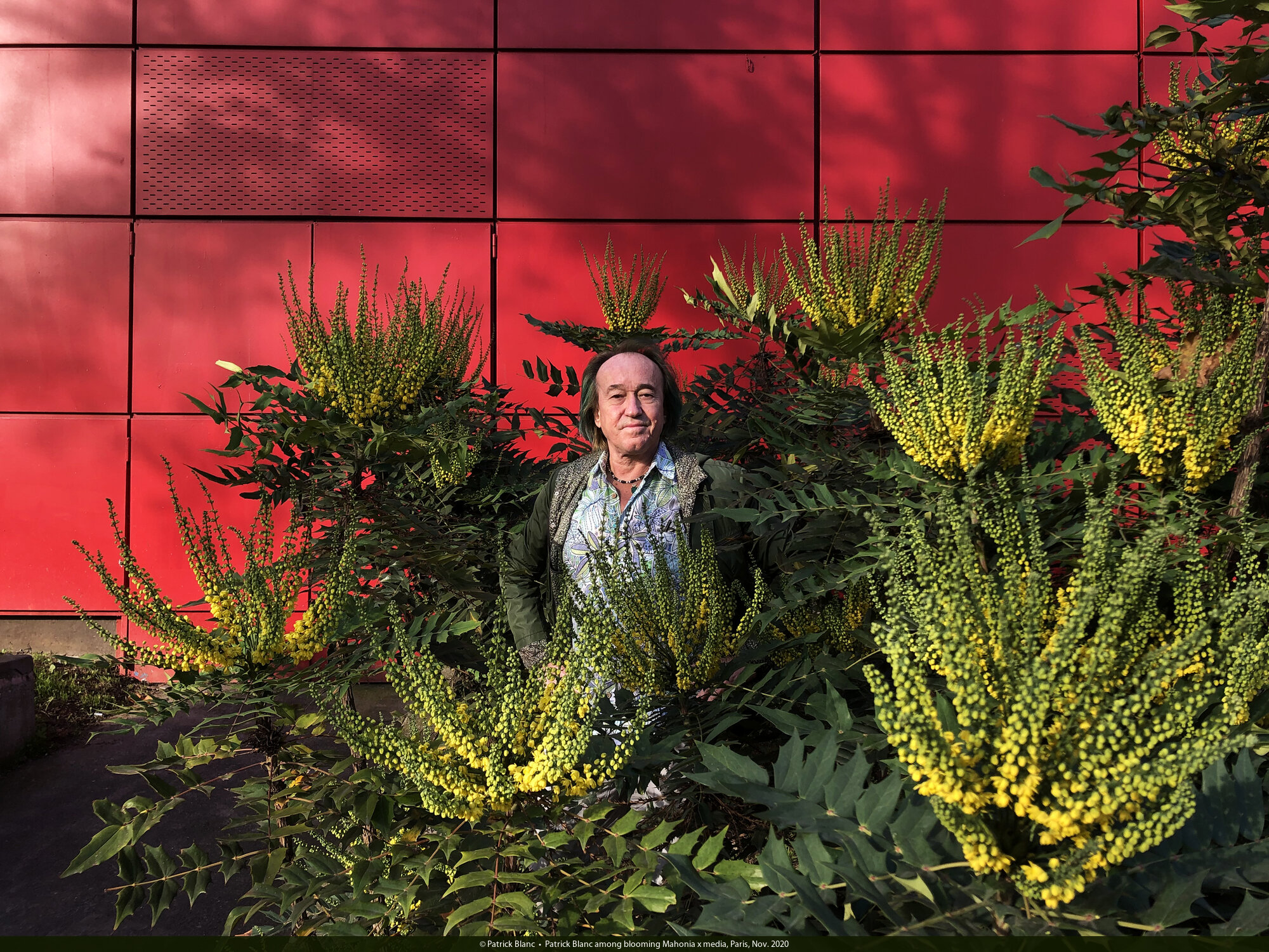 Patrick Blanc among blooming Mahonia x media, Paris, Nov. 2020