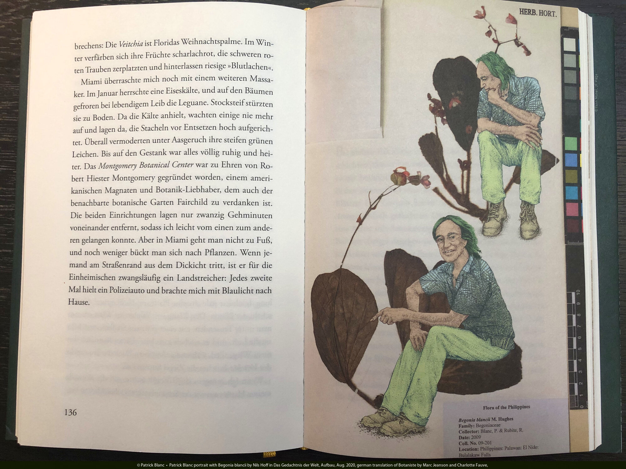 Patrick Blanc portrait with Begonia blancii by Nils Hoff in Das Gedachtnis der Welt, Aufbau, Aug. 2020, german translation of Botaniste by Marc Jeanson and Charlotte Fauve,
