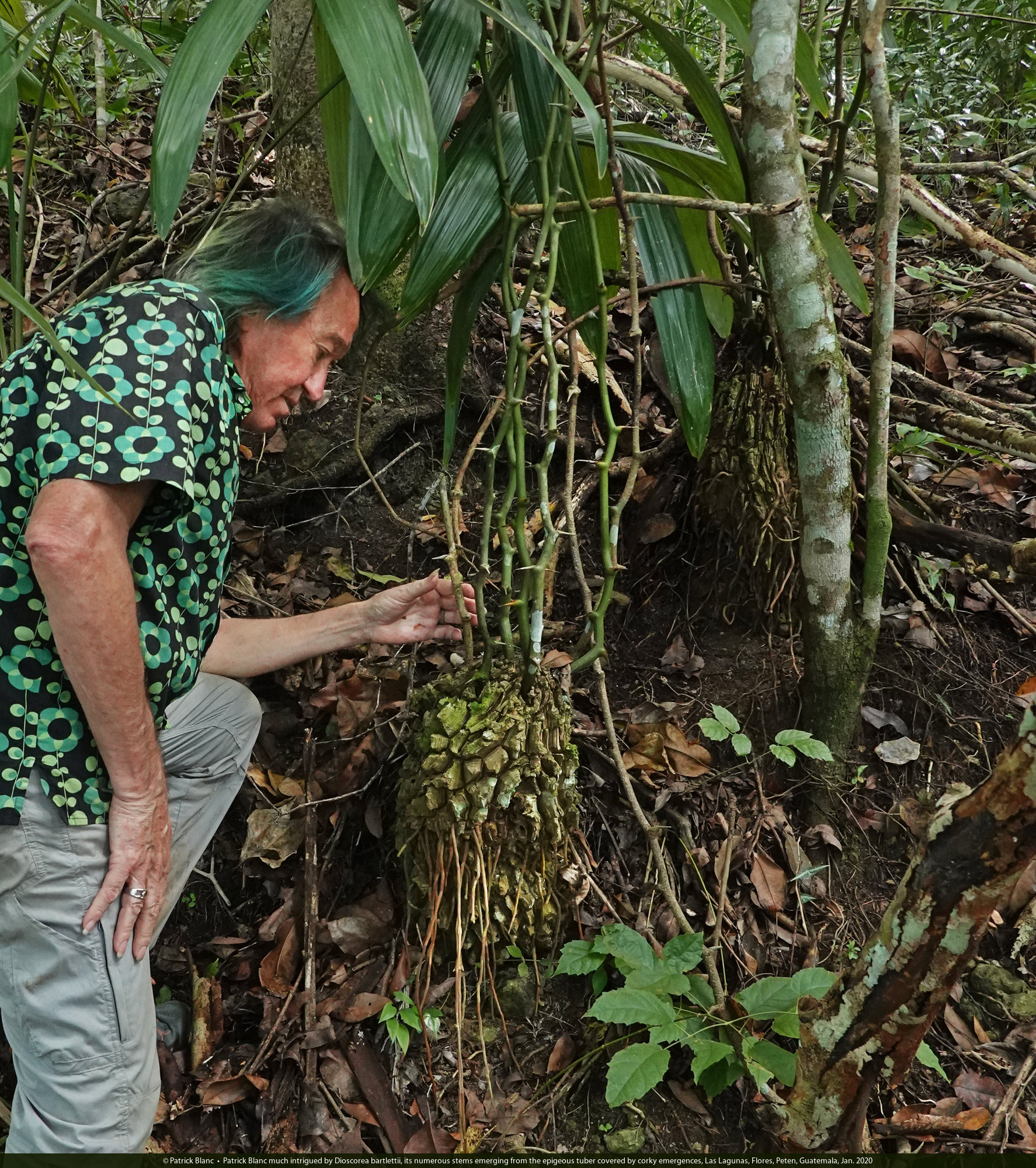 Patrick Blanc observing Dioscorea bartlettii, the numerous stems emerging from the epigeous tuber covered by corky emergences, Las Lagunas, Flores, Peten, Guatemala, Jan. 2020