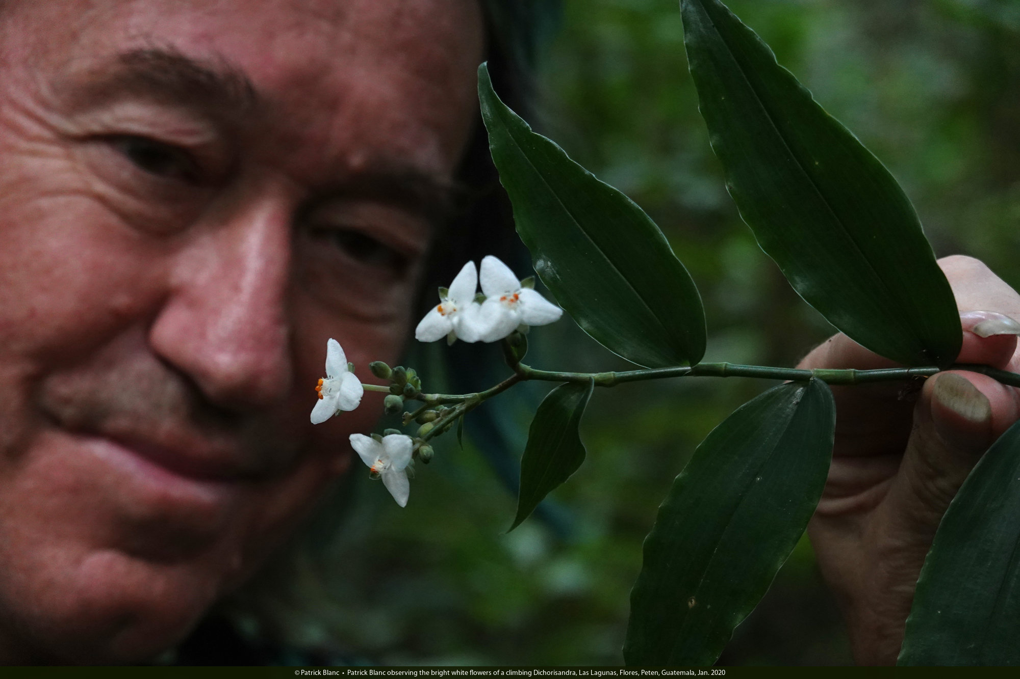 Patrick Blanc observing the bright white flowers of a climbing Dichorisandra, Las Lagunas, Flores, Peten, Guatemala, Jan. 2020