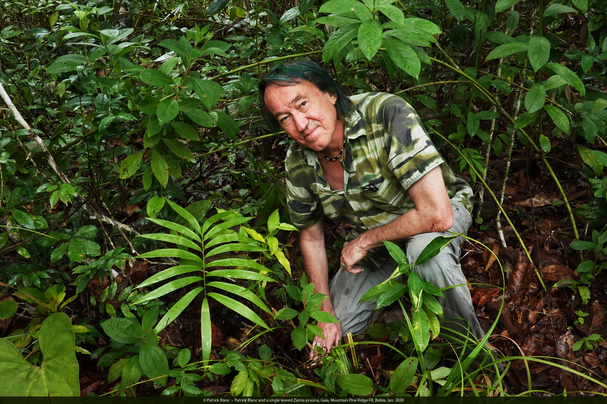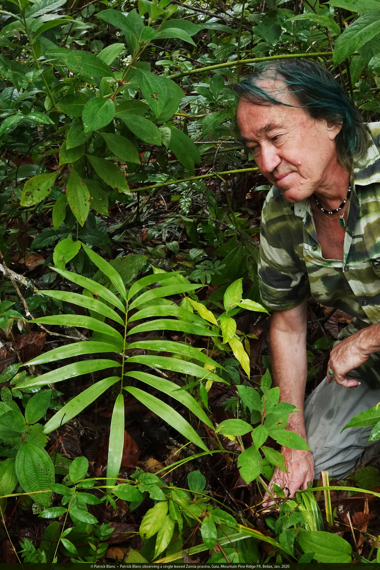 Patrick Blanc observing a single leaved Zamia prasina, Gaia, Mountain Pine Ridge FR, Belize, Jan. 2020