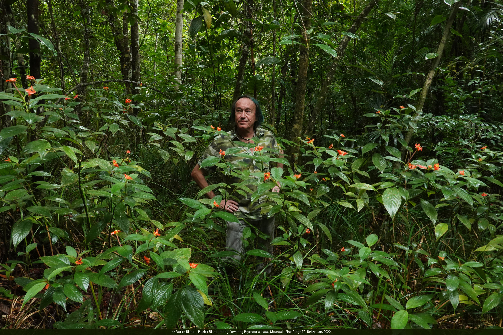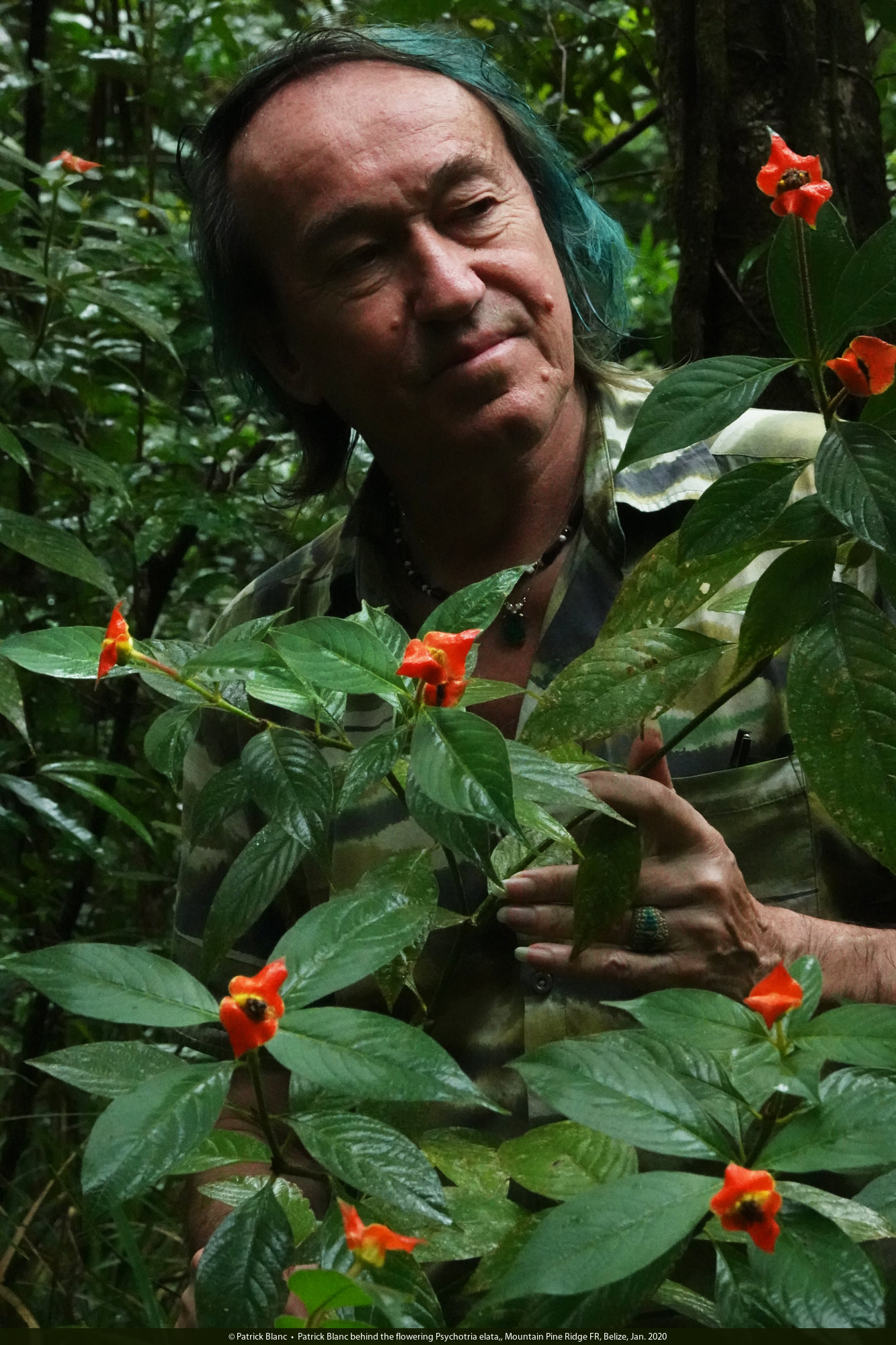 Patrick Blanc behind the flowering Psychotria elata,, Mountain Pine Ridge FR, Belize, Jan. 2020