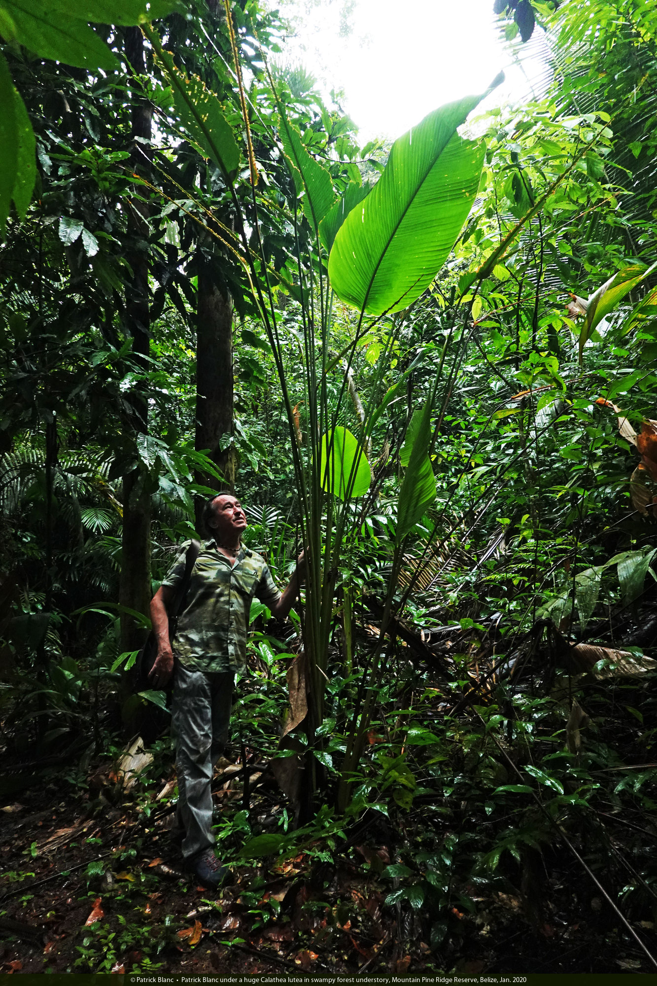 Patrick Blanc under a huge Calathea lutea in swampy forest understory, Mountain Pine Ridge Reserve, Belize, Jan. 2020