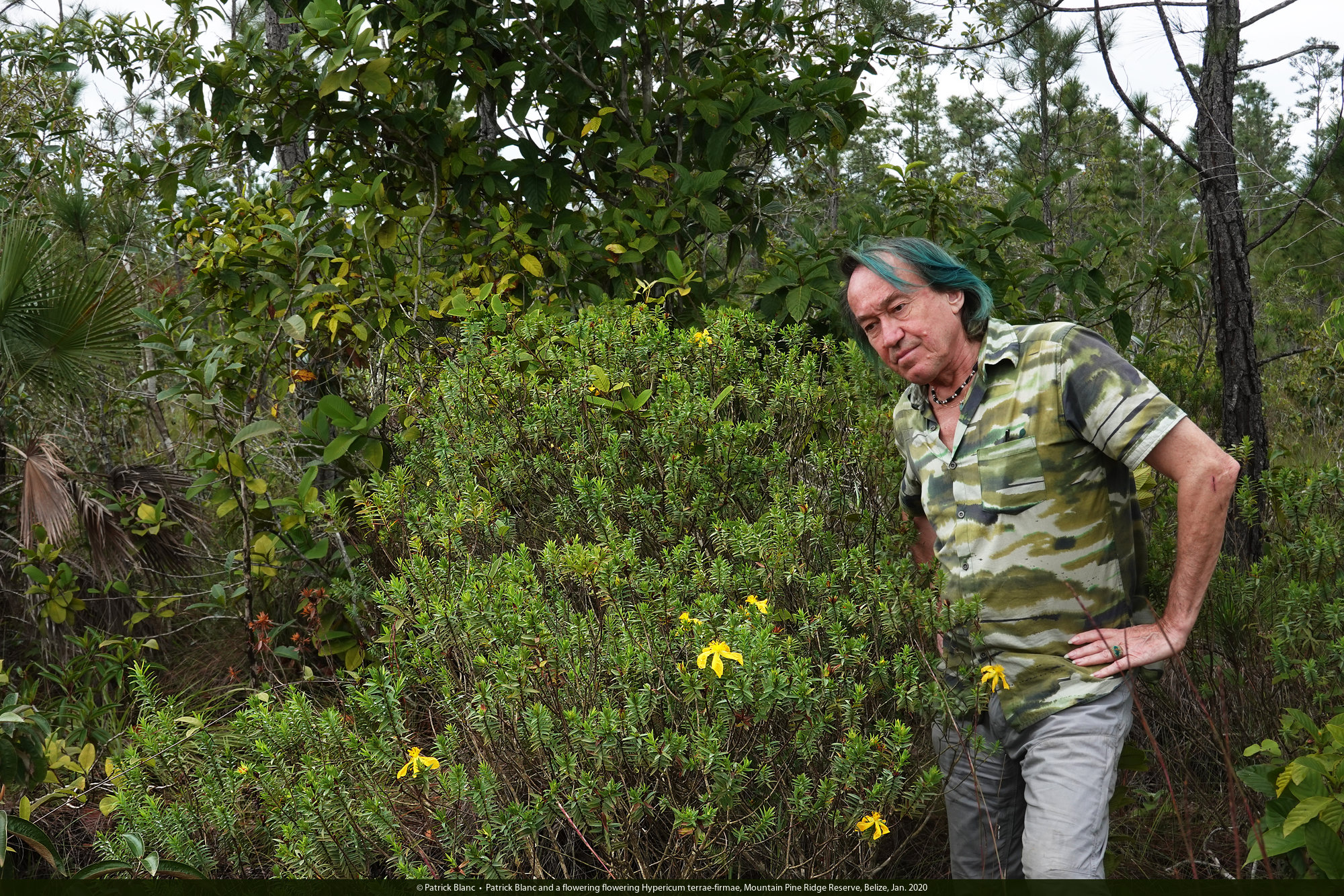 Patrick Blanc and a flowering flowering Hypericum terrae-firmae, Mountain Pine Ridge Reserve, Belize, Jan. 2020