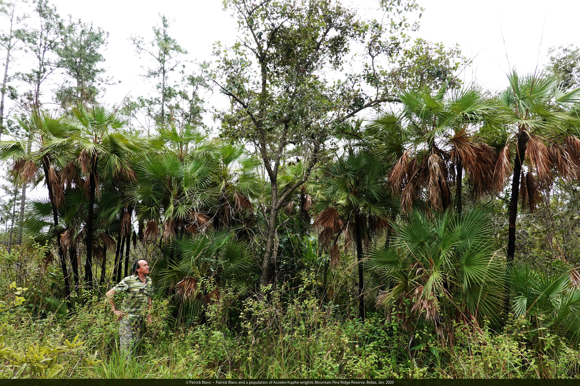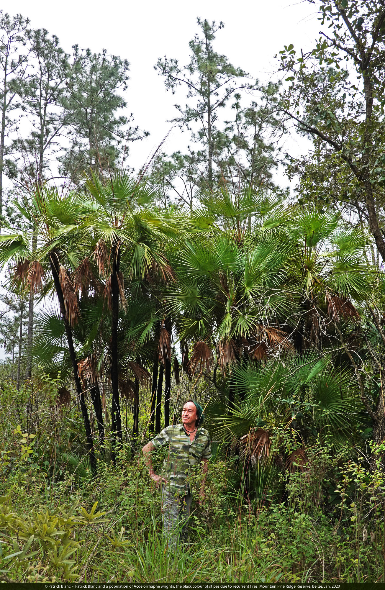 Patrick Blanc and a population of Acoelorrhaphe wrightii, the black colour of stipes due to recurrent fires, Mountain Pine Ridge Reserve, Belize, Jan. 2020
