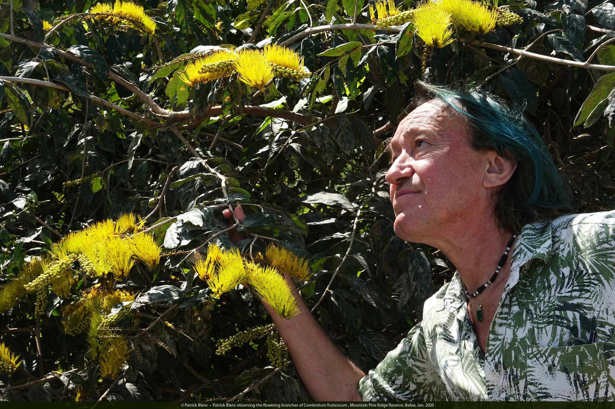 Patrick Blanc observing the flowering branches of Combretum fruticosum , Mountain Pine Ridge Reserve, Belize, Jan. 2020