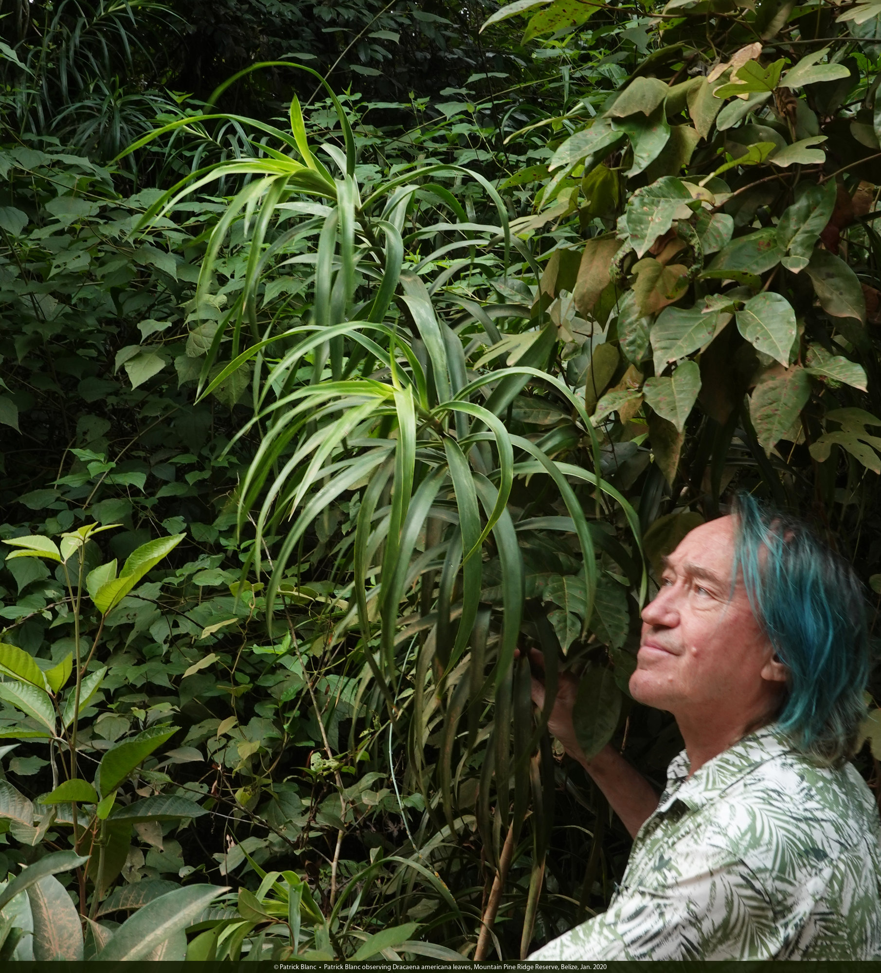 Patrick Blanc observing Dracaena americana leaves, Mountain Pine Ridge Reserve, Belize, Jan. 2020