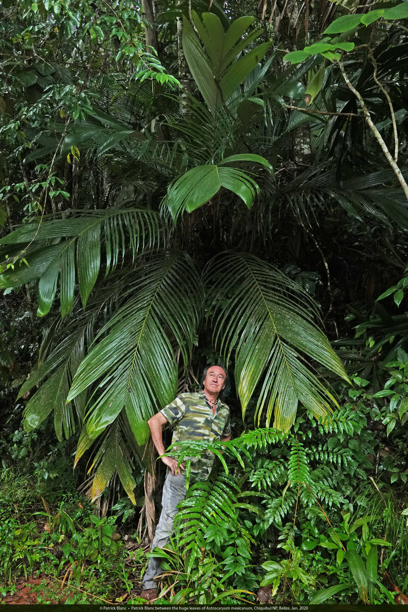 Patrick Blanc between the huge leaves of Astrocaryum mexicanum, Chiquibul NP, Belize, Jan. 2020
