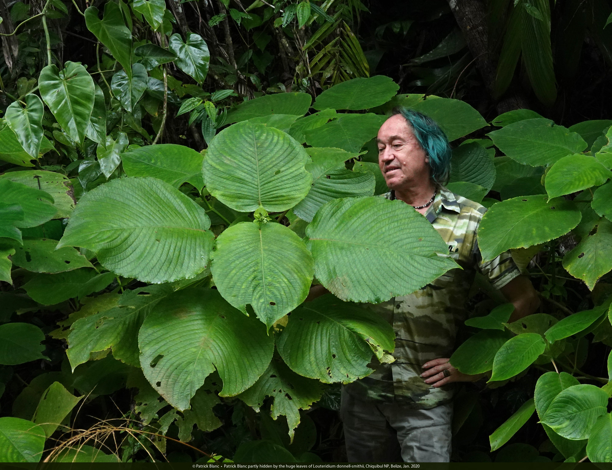 Patrick Blanc partly hidden by the huge leaves of Louteridium donnell-smithii, Chiquibul NP, Belize, Jan. 2020