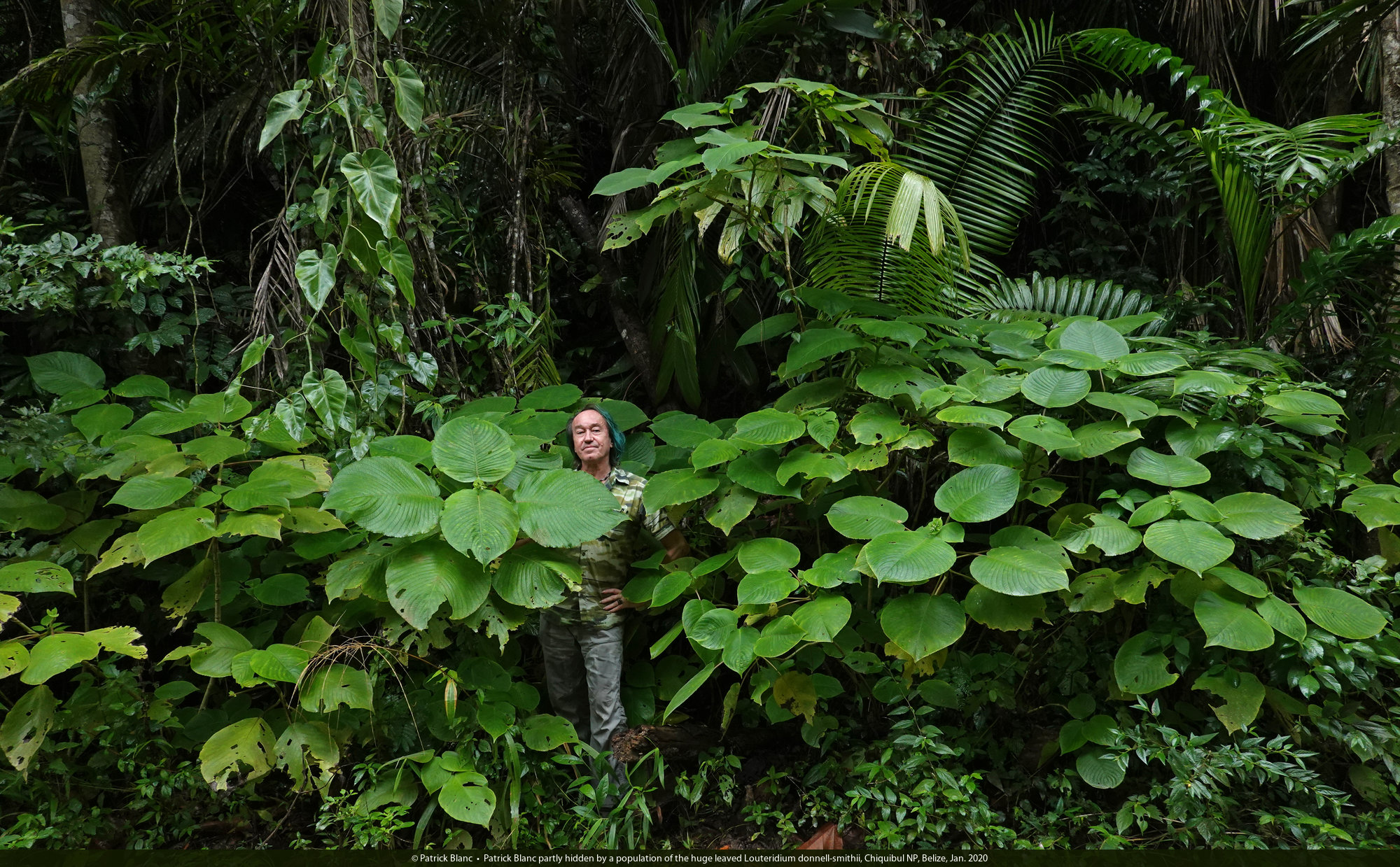 Patrick Blanc partly hidden by a population of the huge leaved Louteridium donnell-smithii, Chiquibul NP, Belize, Jan. 2020