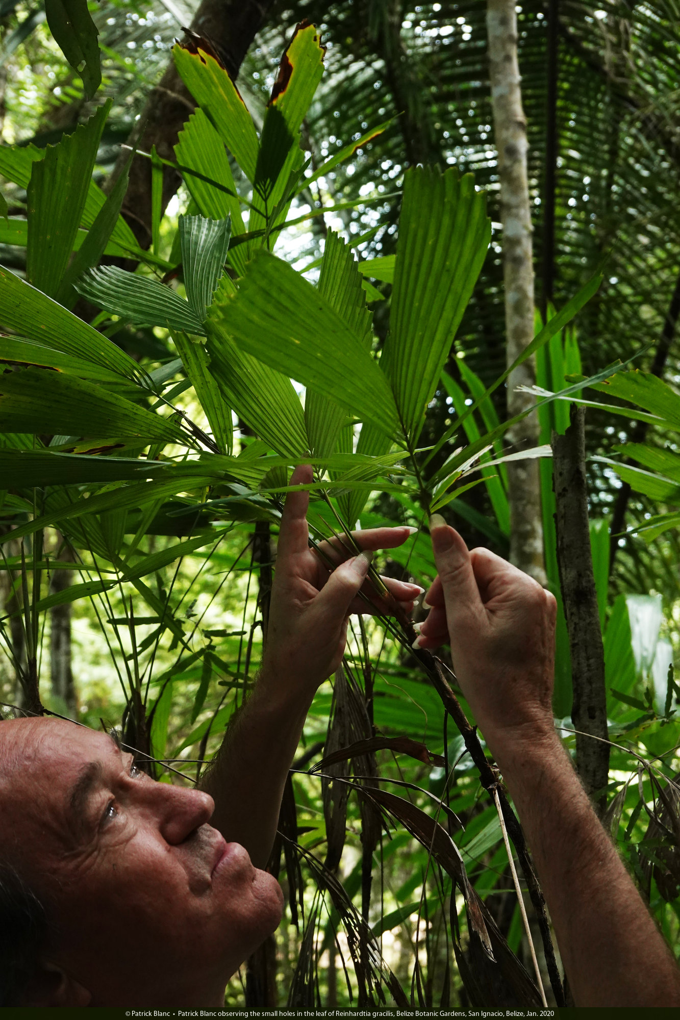 Patrick Blanc observing the small holes in the leaf of Reinhardtia gracilis, Belize Botanic Gardens, San Ignacio, Belize, Jan. 2020