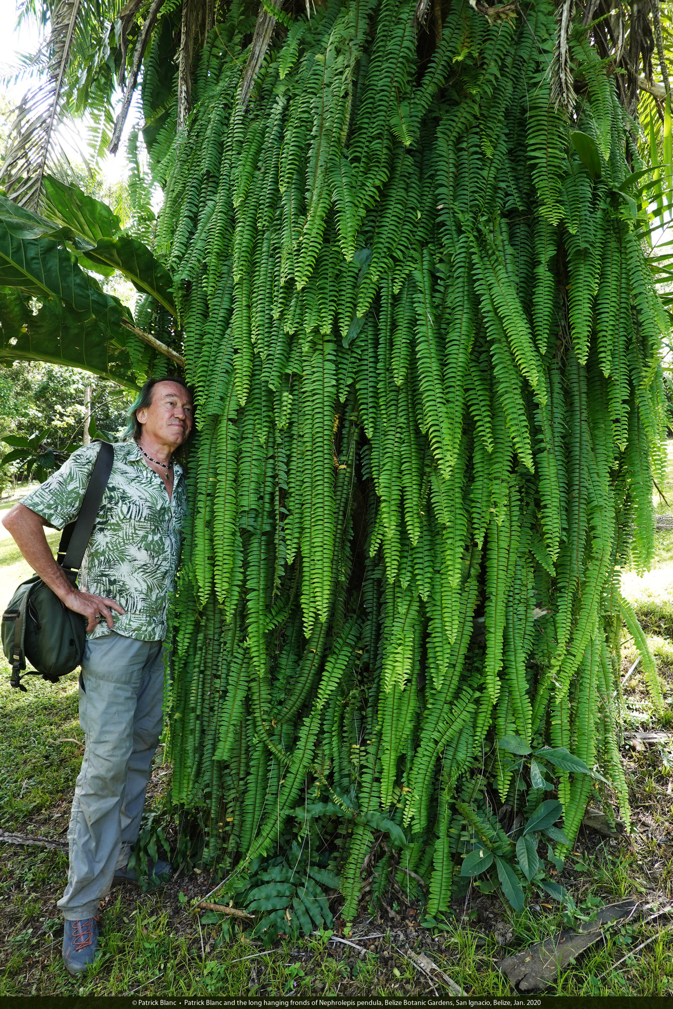 Patrick Blanc and the long hanging fronds of Nephrolepis pendula, Belize Botanic Gardens, San Ignacio, Belize, Jan. 2020