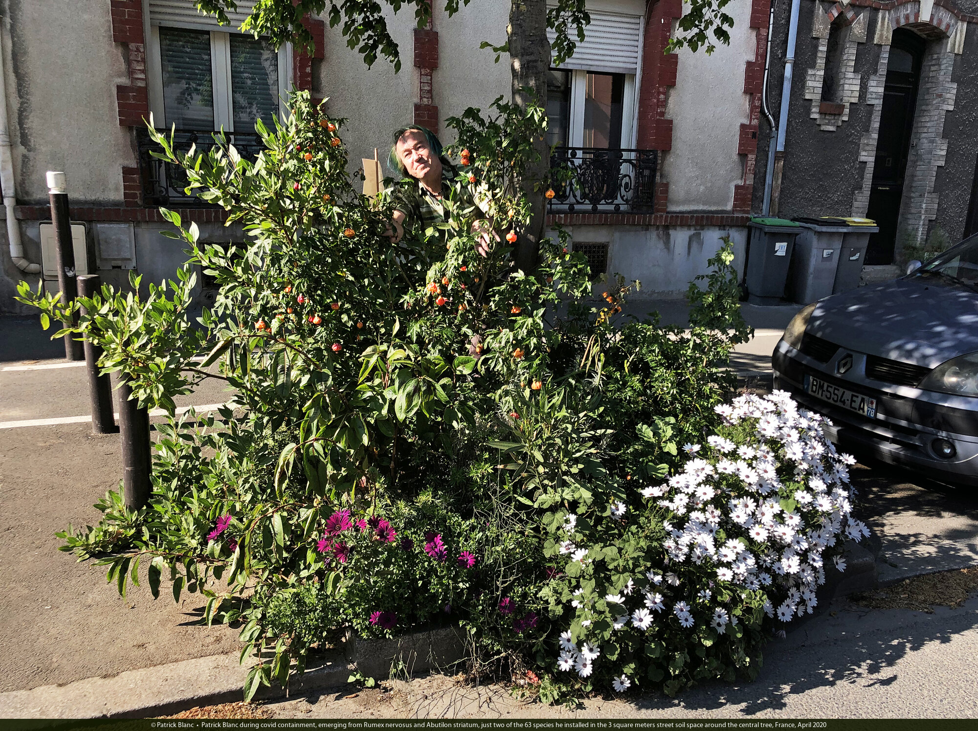 Patrick Blanc during covid containment, emerging from Rumex nervosus and Abutilon striatum, just two of the 63 species he installed in the 3 square meters street soil space around the central tree, France, April 2020