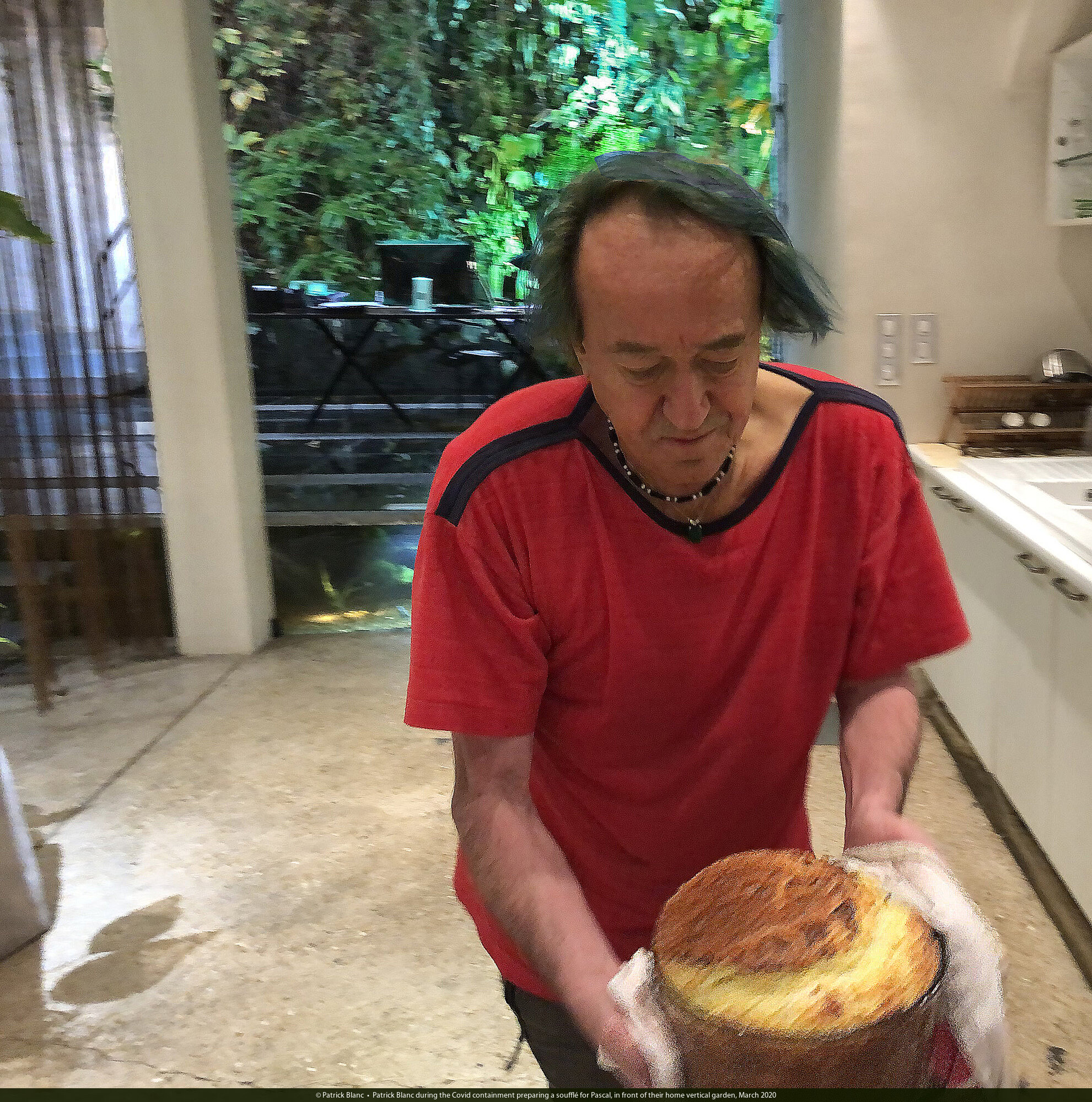 Patrick Blanc during the Covid containment preparing a soufflé for Pascal, in front of their home vertical garden, March 2020