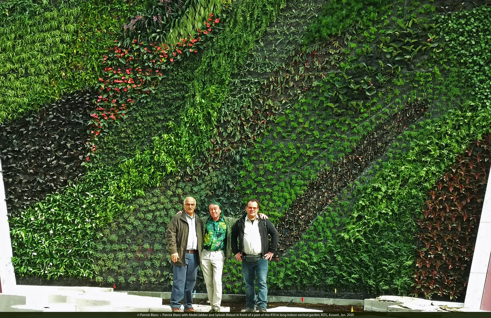 Patrick Blanc with Abdel Jabbar and Sylvain Bidaut in front of a part of the 410 m long indoor vertical garden, KITC, Koweit, Jan. 2020