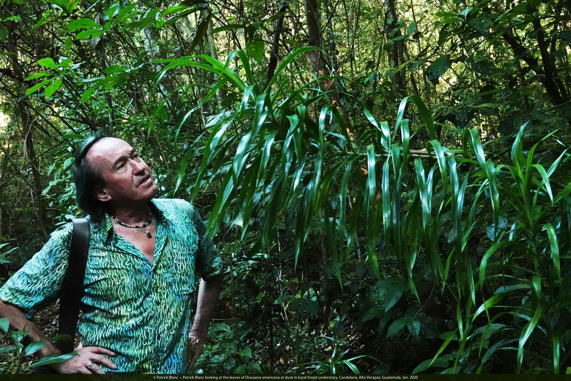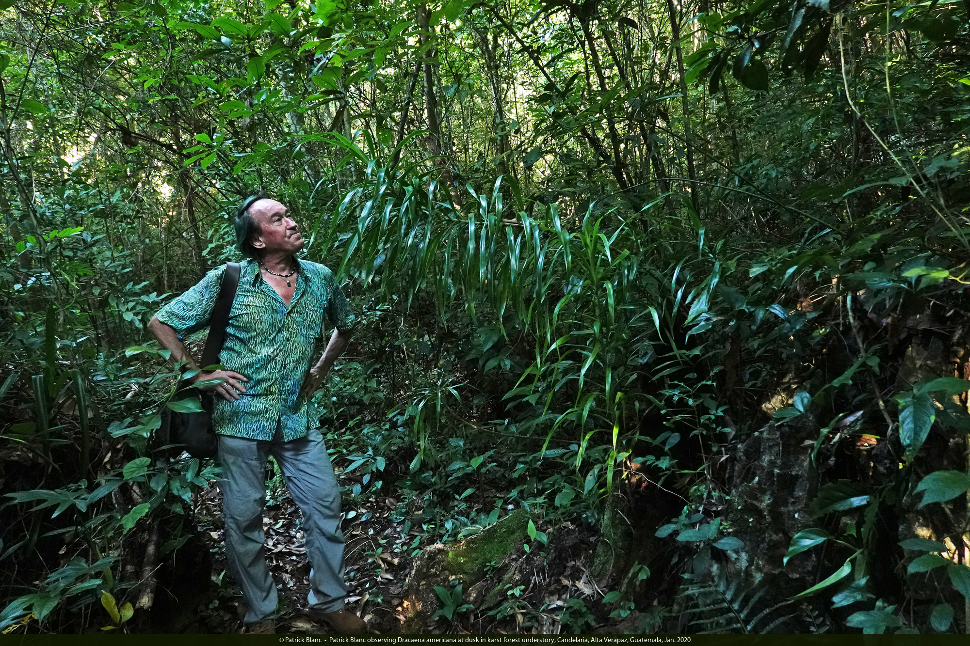 Patrick Blanc observing Dracaena americana at dusk in karst forest understory, Candelaria, Alta Verapaz, Guatemala, Jan. 2020