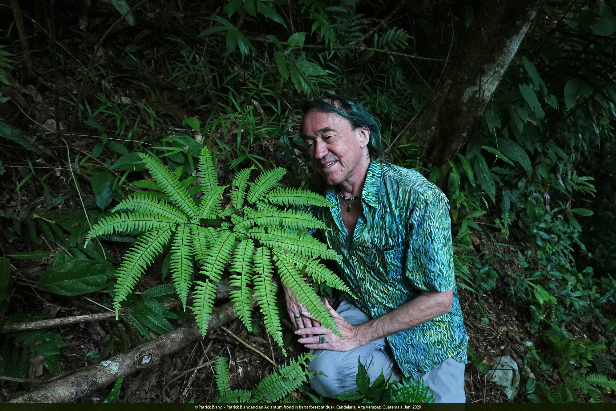 Patrick Blanc and an Adiantum frond in karst forest at dusk, Candelaria, Alta Verapaz, Guatemala, Jan. 2020