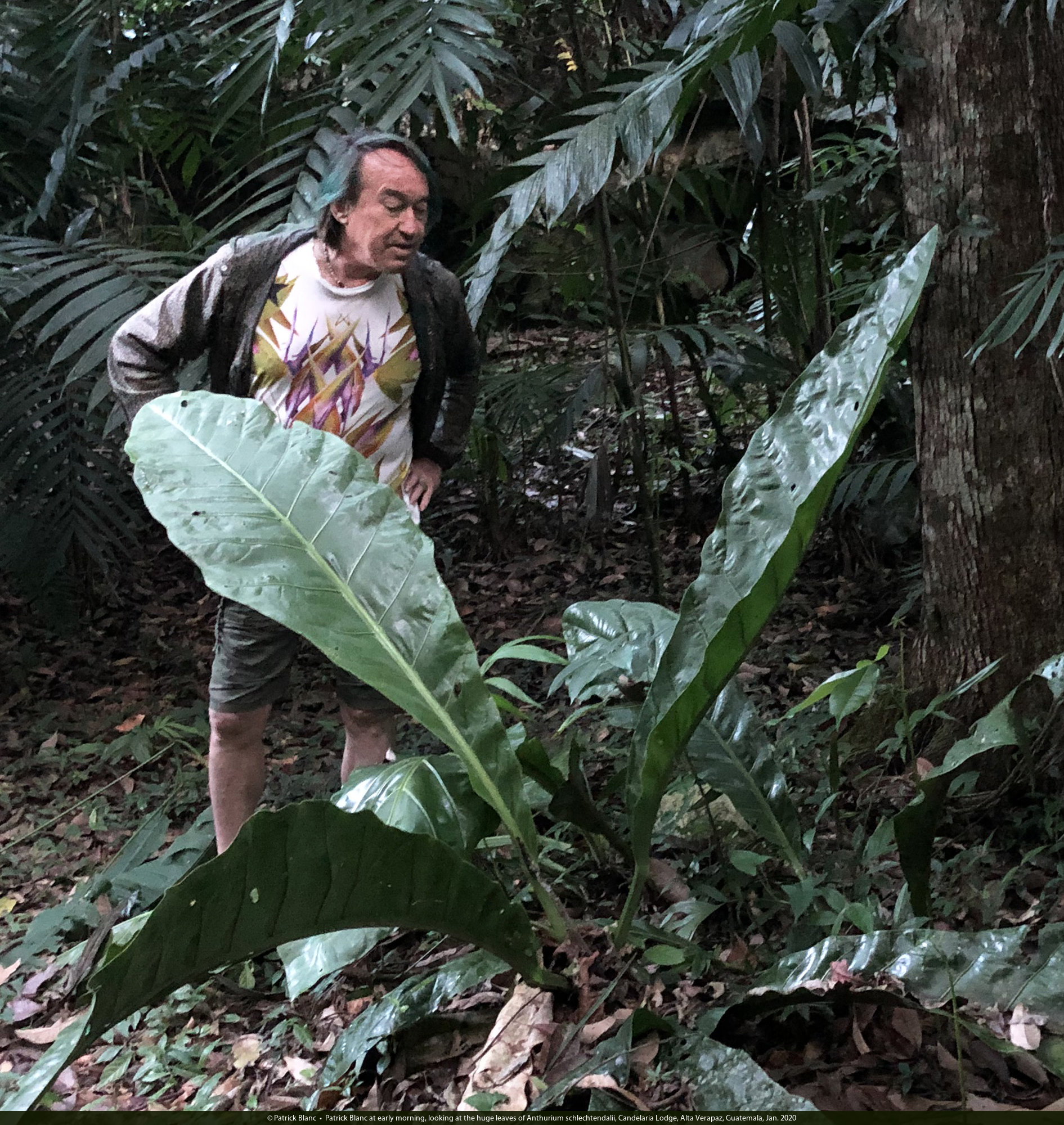 Patrick Blanc at early morning, looking at the huge leaves of Anthurium schlechtendalii, Candelaria Lodge, Alta Verapaz, Guatemala, Jan. 2020