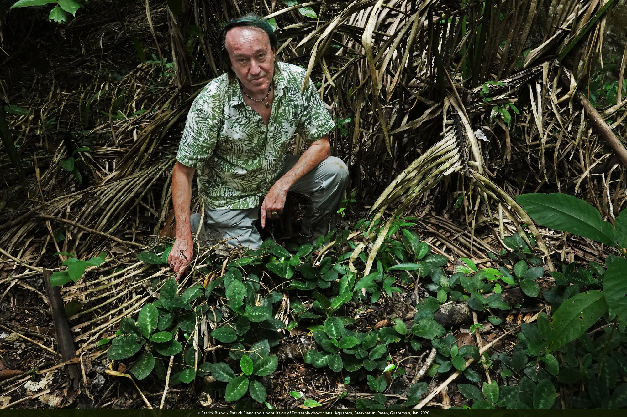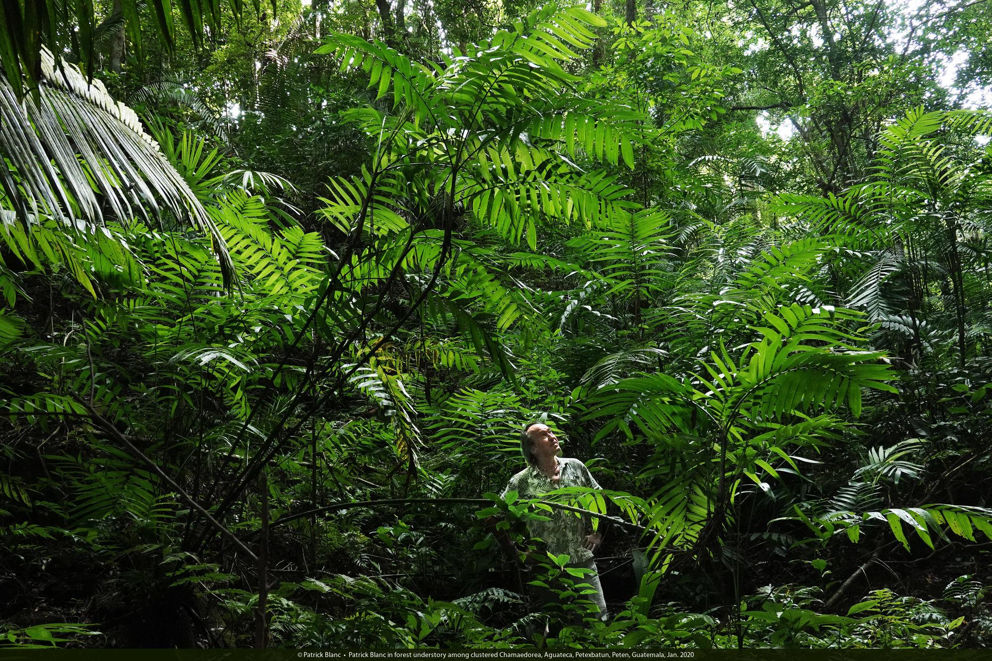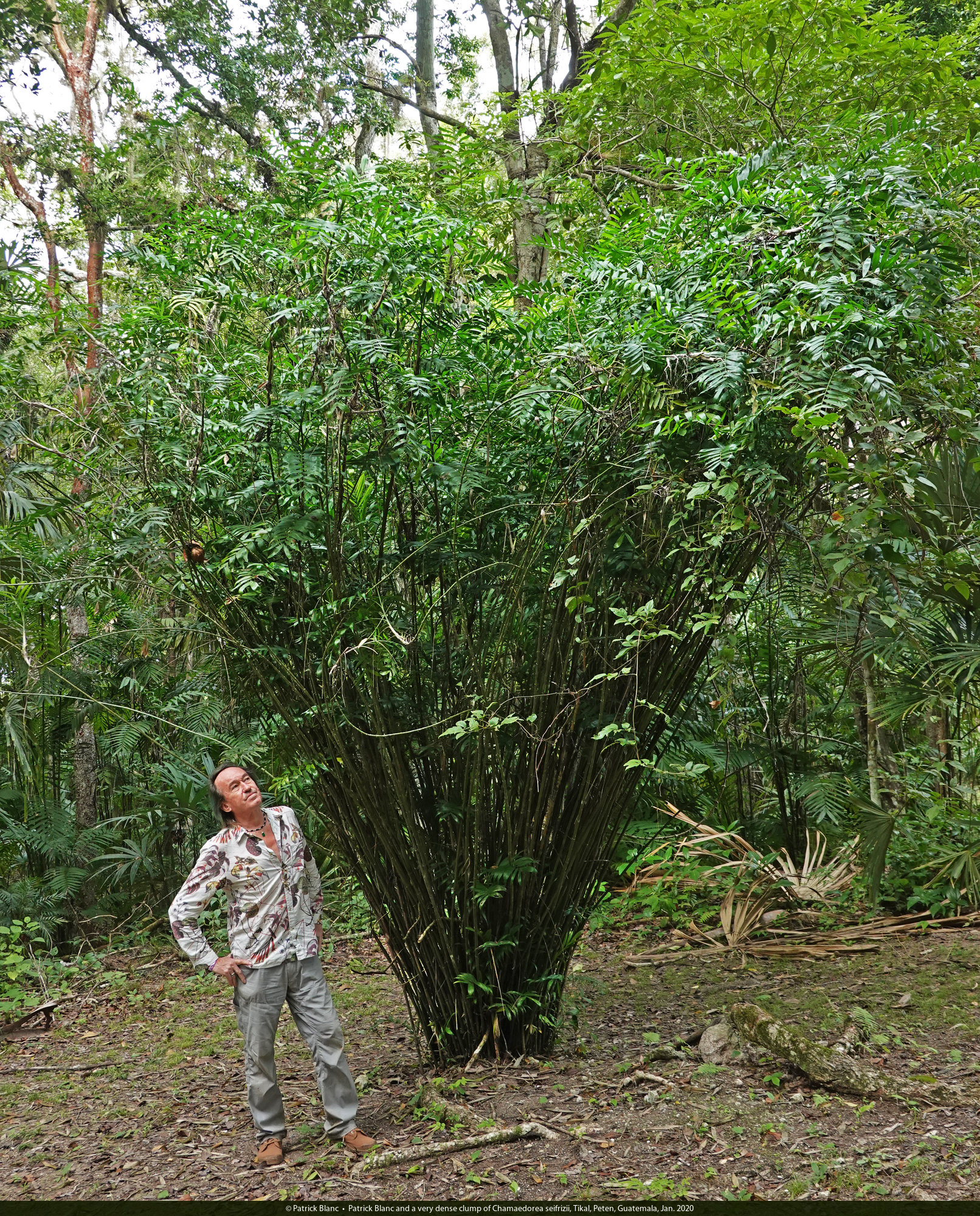Patrick Blanc and a very dense clump of Chamaedorea seifrizii, Tikal, Peten, Guatemala, Jan. 2020