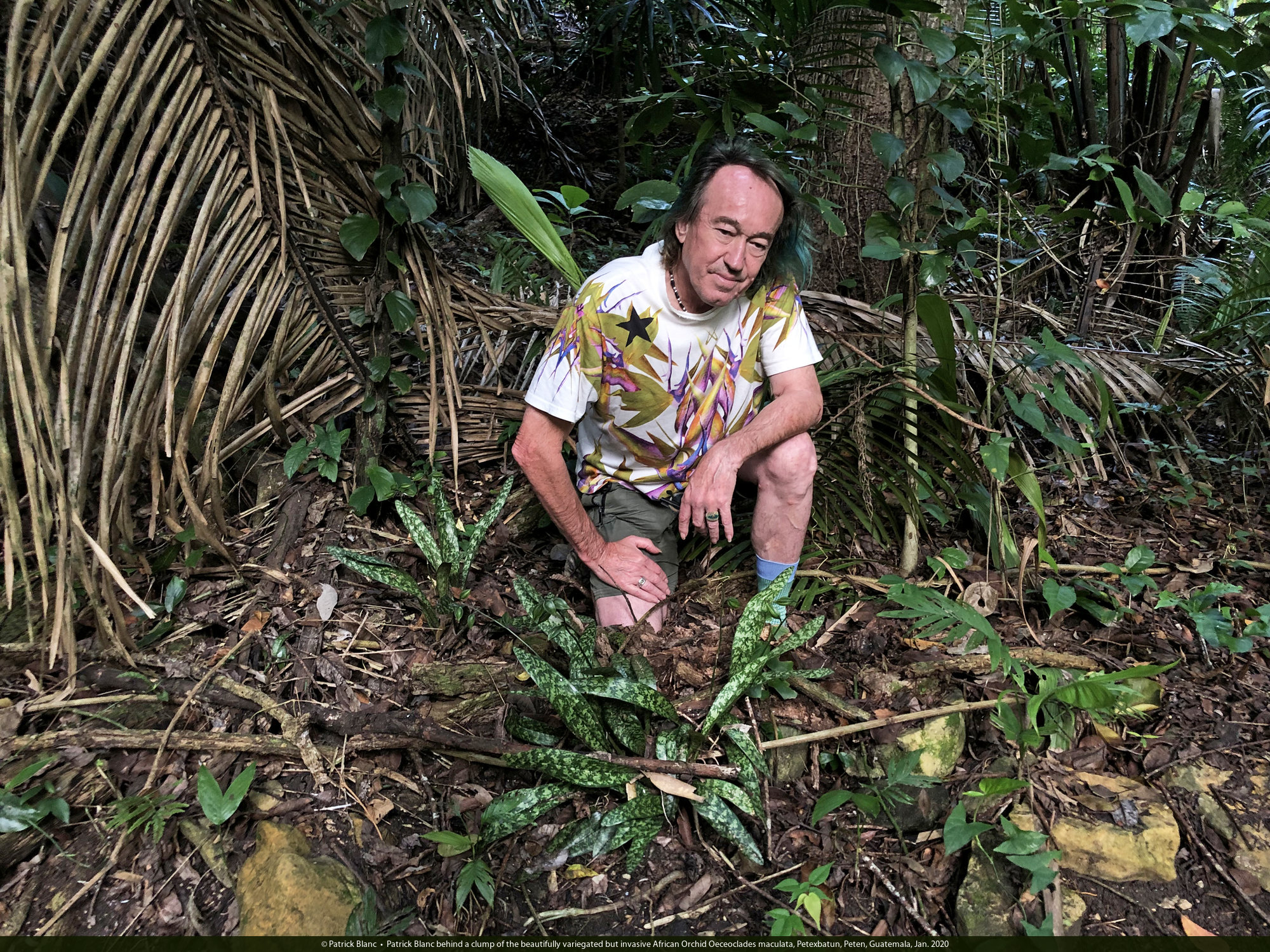 Patrick Blanc behind a clump of the beautifully variegated but invasive African Orchid Oeceoclades maculata, Petexbatun, Peten, Guatemala, Jan. 2020