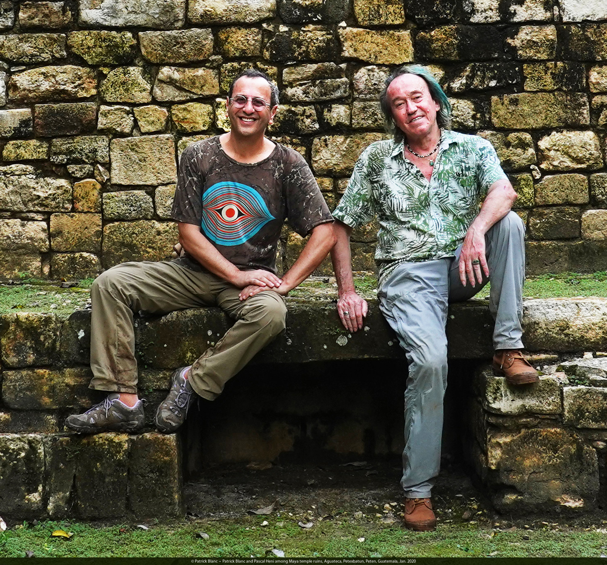 Patrick Blanc and Pascal Heni among Maya temple ruins, Aguateca, Petexbatun, Peten, Guatemala, Jan. 2020