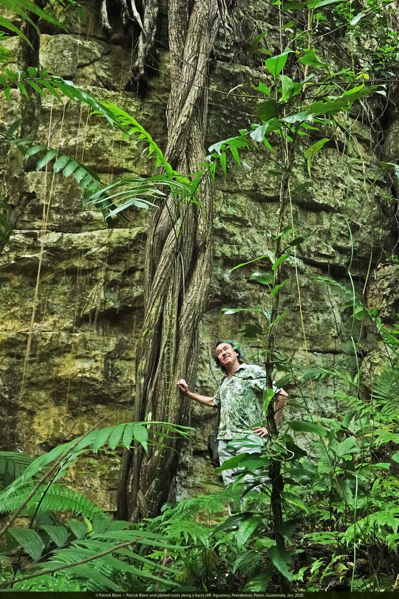 Patrick Blanc and plaited roots along a karst cliff, Aguateca, Petexbatun, Peten, Guatemala, Jan. 2020