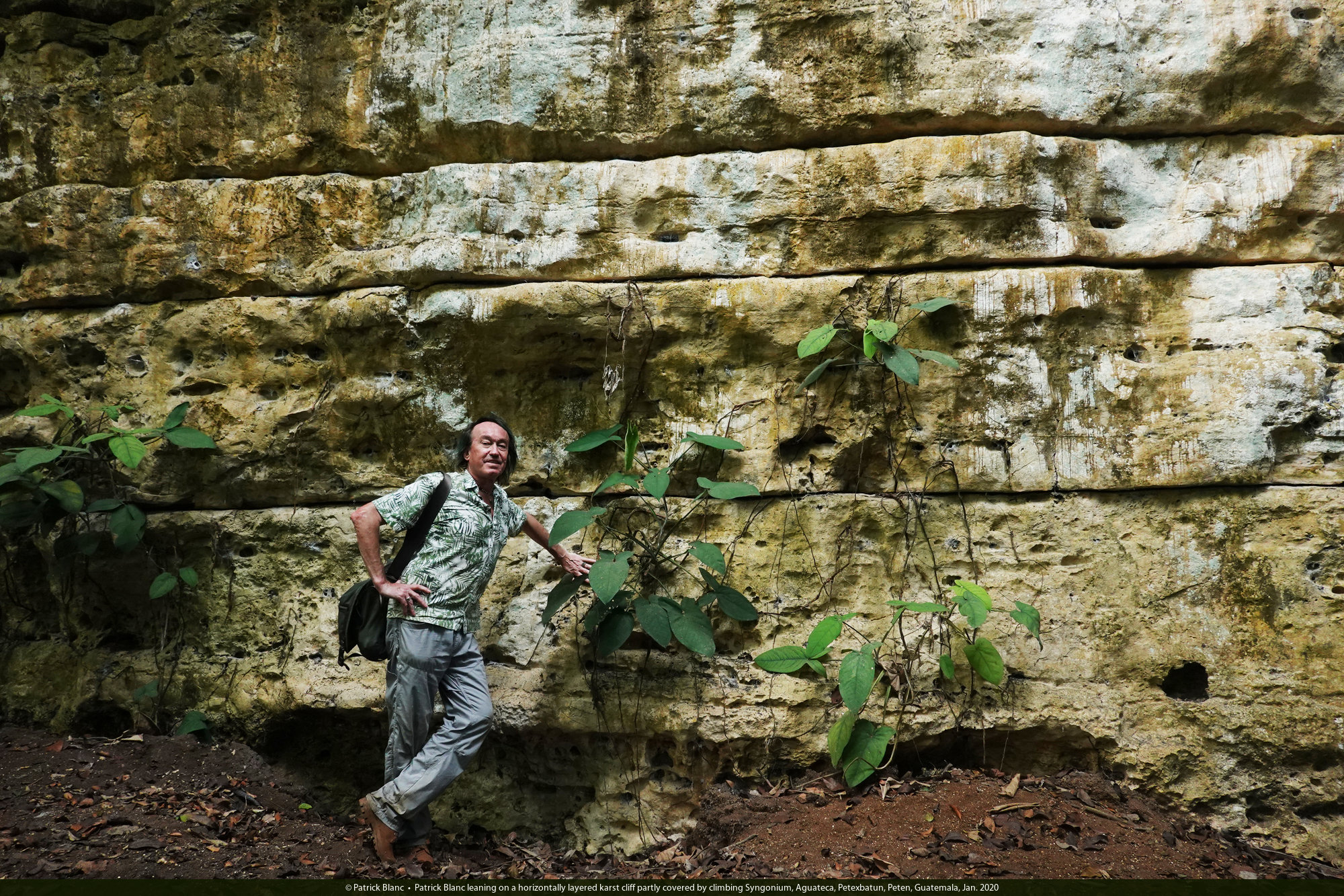 Patrick Blanc leaning on a horizontally layered karst cliff partly covered by climbing Syngonium, Aguateca, Petexbatun, Peten, Guatemala, Jan. 2020